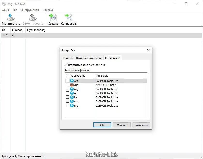 - Монтирование образов ISO, Cue, NRG, MDS/MDF, CCD, ISZ одним щелчком мыши.
