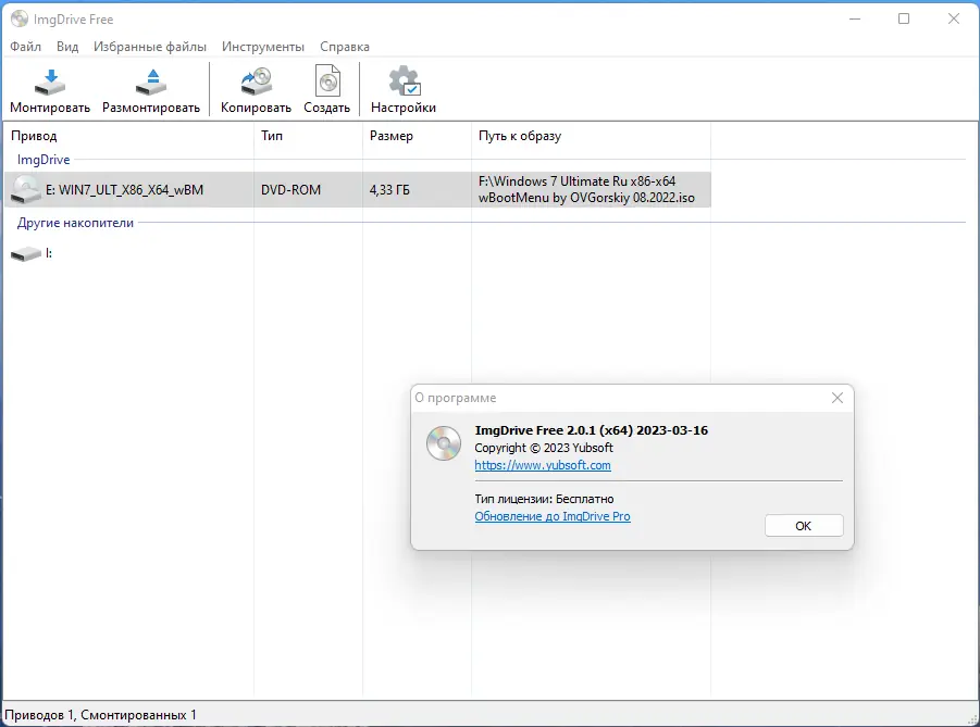 Облегчите работу с виртуальными дисками благодаря ImgDrive, который обеспечивает простое и надежное монтирование образов ISO, CUE, NRG, MDS/MDF, CCD, ISZ и аудио файлов таких как APE, FLAC и WAV как виртуальных CD-дисков. Поддержка 32- и 64-разрядных систем Windows от 7 до 11 гарантирует совместимость с современными ПК. Программа позволяет работать без перезагрузки, имеет мульти-приводную систему (до 4 приводов одновременно) и возможность работы через командную строку. Для удобства доступны как портативная версия и версия pro с расширенными функциями. ImgDrive — отличный выбор как для профессионалов, так и для любителей, желающих бесплатно использовать мощный инструмент для эмуляции дисков без необходимости установки через торрент или сторонние источники.