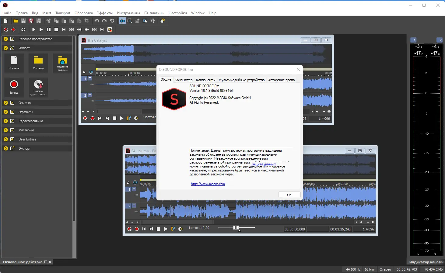 MAGIX Sound Forge – это мощное решение для профессиональной записи, редактирования и мастеринга аудиоматериалов, которое уже более 20 лет задает стандарты в сфере обработки звука. Ориентированная как на опытных звукорежиссеров и депюсеров, так и на начинающих артистов, программа обеспечивает работу с высоким качеством и точностью. Благодаря 64-битным технологиям, инновационным алгоритмам и расширяемой архитектуре, Sound Forge Pro предлагает уникальные возможности для создания, редактирования и восстановления звука с минимальными искажениями и максимумом деталей.