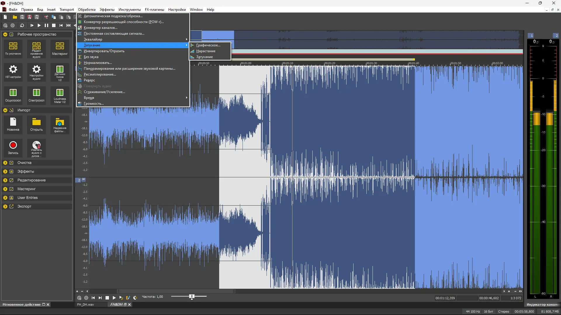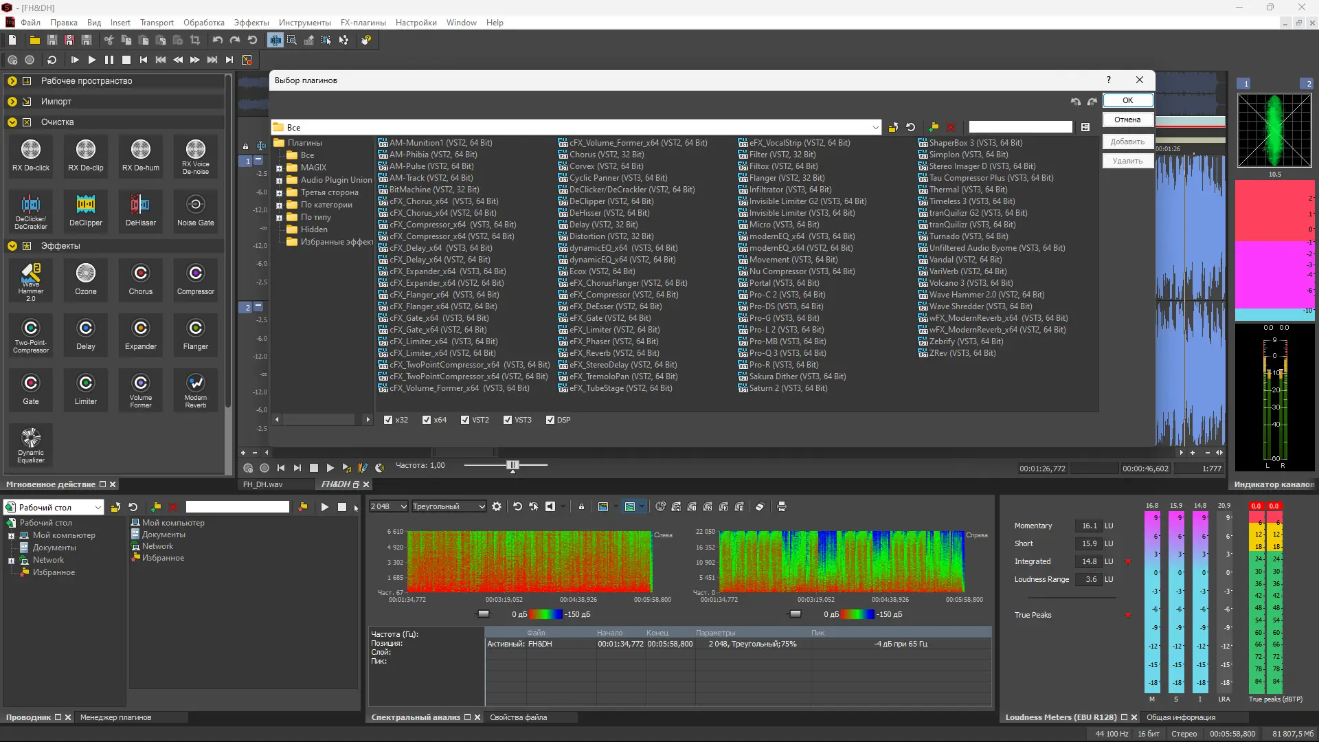 - Встроенные мощные плагины для мастеринга и очистки звука, включая DeHisser, DeClicker и DeClipper, а также эффекты задержки и реверберации.