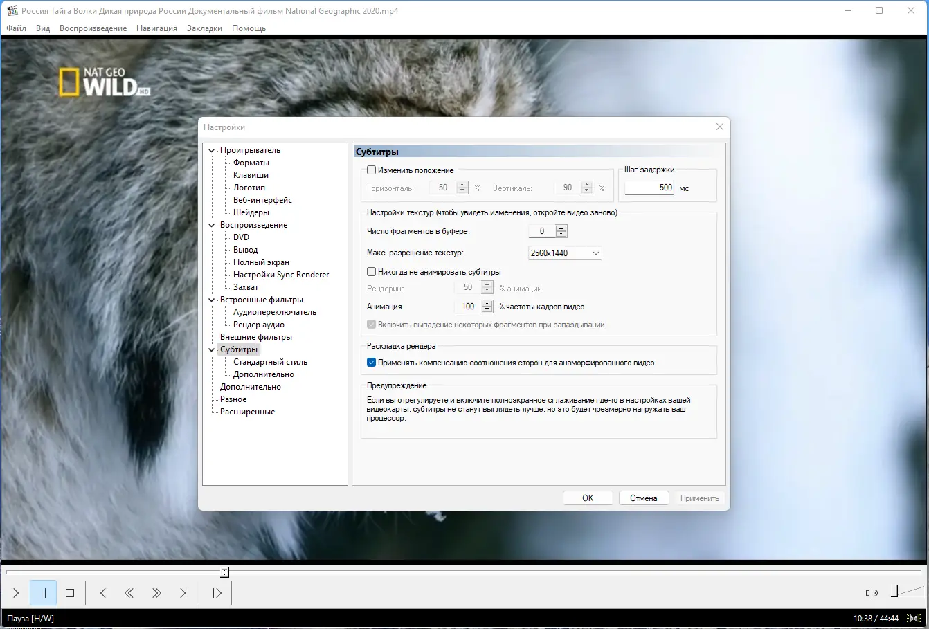 - Работа с субтитрами различных форматов и их настройка, в том числе поддержка ASS и WebVTT.