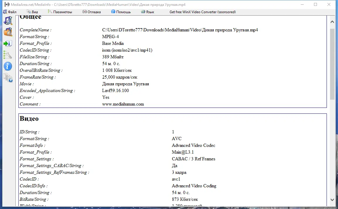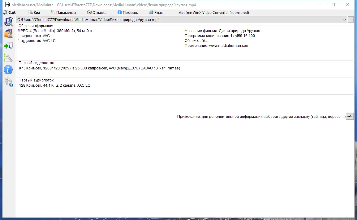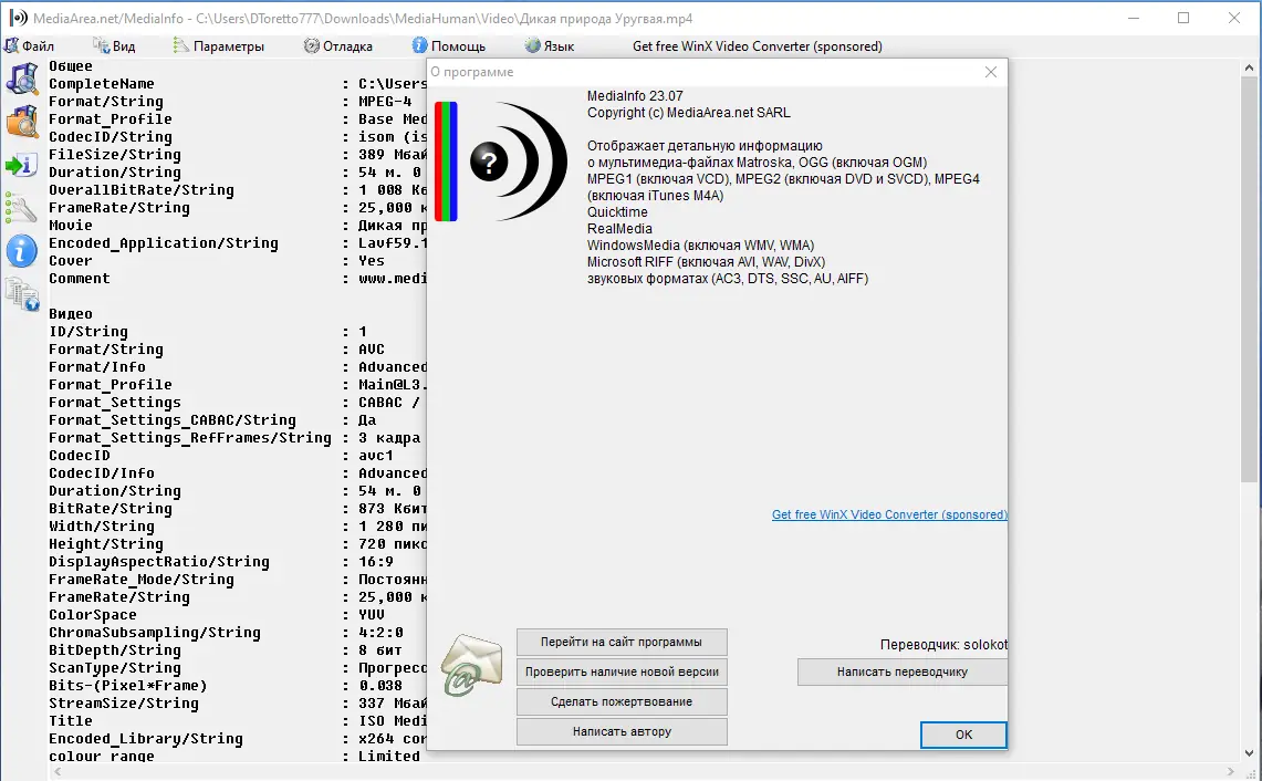 MediaInfo — это бесплатное программное обеспечение с открытым исходным кодом, распространяемое под лицензиями GPL и LGPL. Оно позволяет определить технические параметры аудио- и видеофайлов с поддержкой широкого спектра форматов, таких как MKV, AVI, MP3, WAV, субтитры различных типов и многое другое. Приложение использует различные способы отображения информации: в виде текста, листа, дерева или HTML-отчёта, что обеспечивает гибкость в изучении данных. Также программа интегрируется в оболочку Windows, поддерживая drag’n’drop, контекстное меню и локализацию интерфейса на практически любой язык.