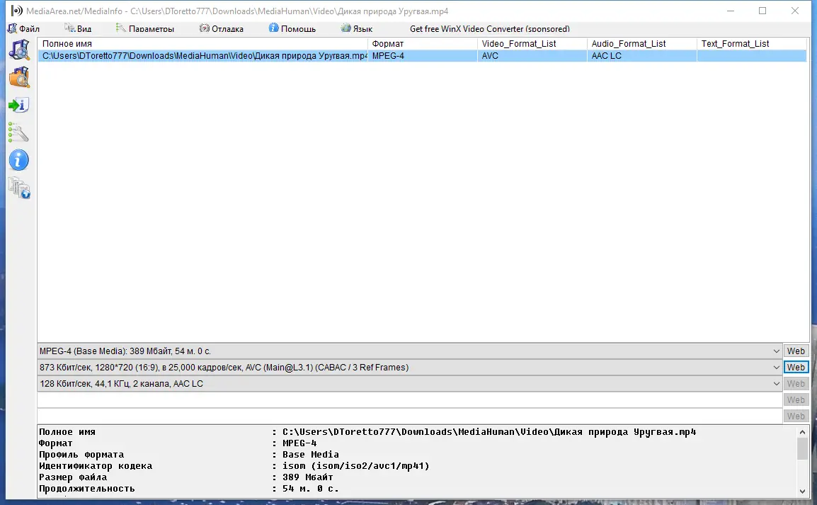 - Подробный разбор аудио: кодек, количество каналов, язык, скорость передачи данных.
