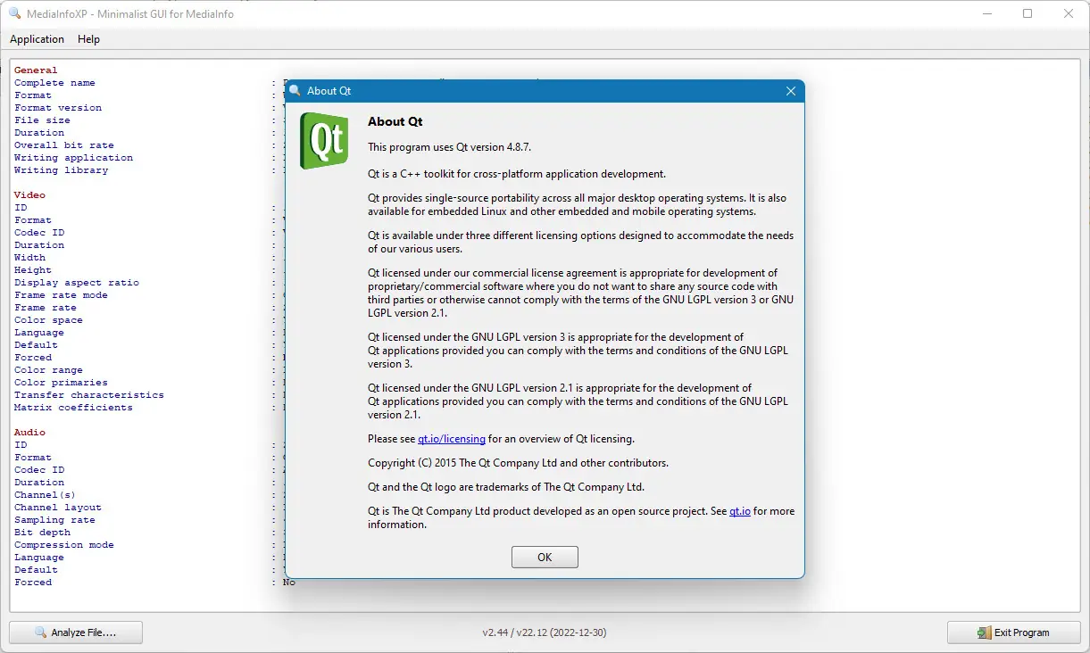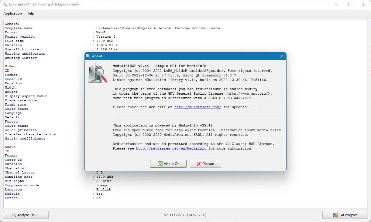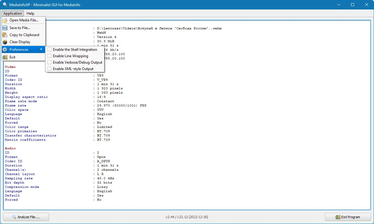 MediaInfoXP — это бесплатная портативная программа с открытым исходным кодом, разработанная для получения технической информации о видео- и аудиофайлах. Интерфейс выполнен в минималистичном стиле и может встраиваться в проводник по желанию пользователя, обеспечивая удобство работы и быстрый доступ к данным.