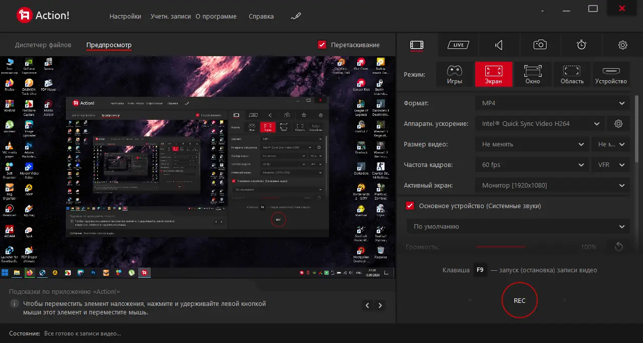 Mirillis Action — это профессиональный инструмент для захвата игрового процесса и создания видеоуроков. Она предлагает пользователям интуитивно понятный интерфейс, где все нужные функции расположены удобно и доступны мгновенно. Благодаря передовому движку записи видео, программа требует минимальных ресурсов системы, обеспечивая высокую частоту кадров до 120 кадров в секунду и превосходное качество изображения. Записанные файлы сохраняются в формате MP4 (H.264/AVC), что гарантирует меньший размер и удобство последующего редактирования и публикации. Возможность мгновенного экспорта и прямой публикации на видеосервисы значительно ускоряет рабочий процесс. Программа не требует регистрации и совместима с разными версиями Windows, в том числе Windows 7, 8/8.1, 10 и 11 на архитектуре x32 и x64 Bit.