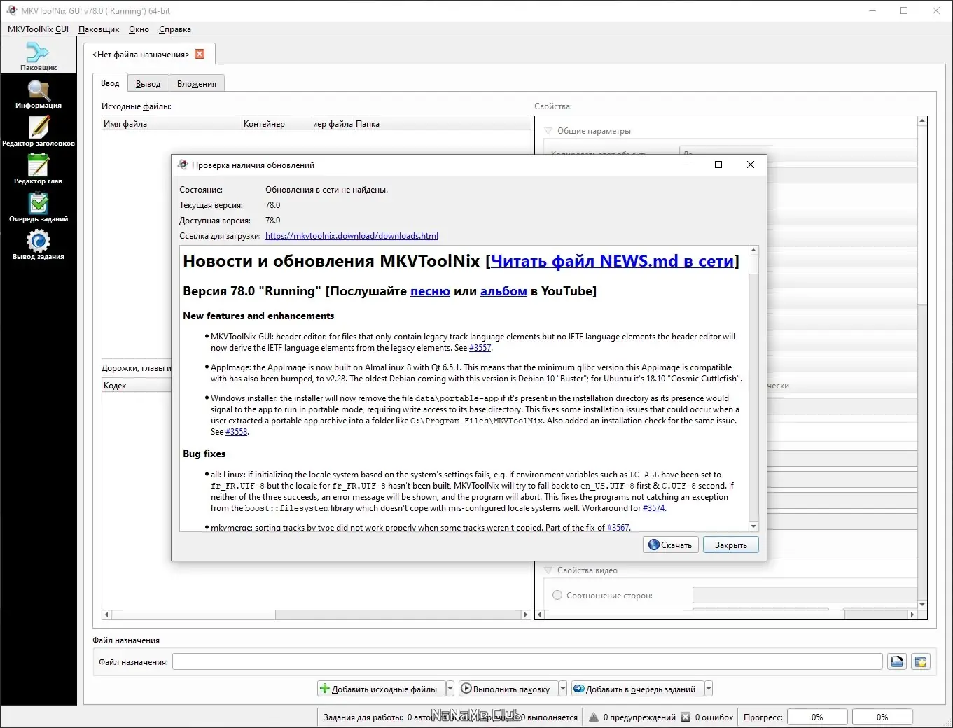 MKVToolnix — это функциональный и открытый проект, предназначенный для работы с мультимедийными контейнерами Matroska (MKV). Программа поддерживает работу не только с MKV, но и с такими форматами потоков как AVI, Ogg/OGM, и RealVideo. Основная задача — создание и редактирование мультидорожечных файлов, содержащих видео, аудио и субтитры, а также добавление служебной информации для создания интерактивных меню и управления таймингом. Формат MKV отличается открытым исходным кодом, что позволяет любому разработчику совершенствовать его функциональность. Мы предлагаем скачать полную версию программы бесплатно, которая полностью совместима с ОС Windows 7, 8/8.1, 10 и 11, в версиях для x32 и x64 Bit.