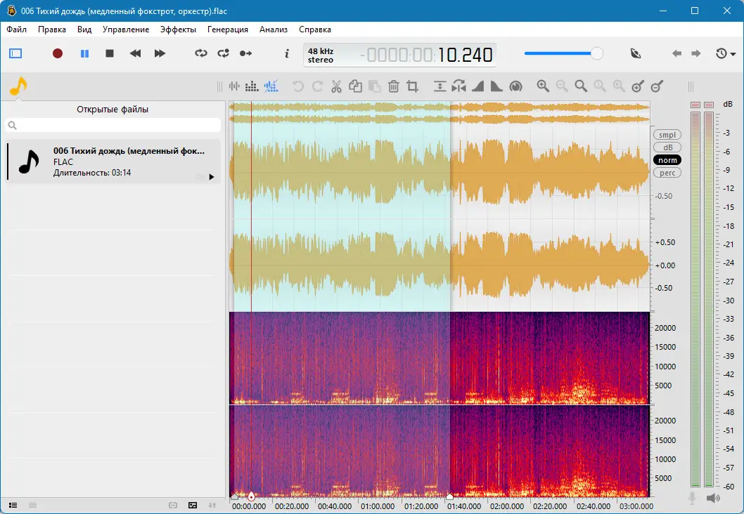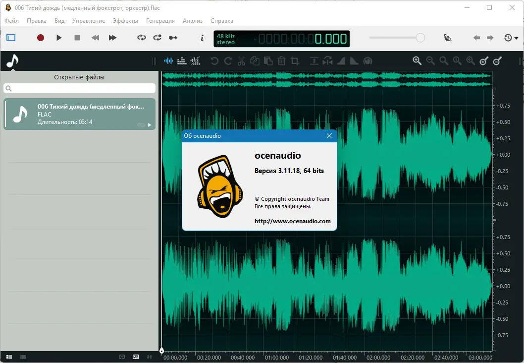 Ocenaudio — это мощный и одновременно простой в использовании аудиоредактор, распространяемый авторскими группами абсолютно бесплатно. Программа поддерживает работу в операционных системах Windows 7, 8/8.1, 10, 11, а также в дистрибутивах Linux и Mac OS X. Благодаря использованию библиотеки Ocen Framework, редактор обеспечивает высокую производительность и удобство при работе со звуковыми файлами, независимо от мощности вашего компьютера. Современный интерфейс и широкие функциональные возможности позволяют как новичкам, так и профессионалам выполнять качественное редактирование аудио, реализуя такие задачи, как обработка больших файлов, многократный выбор участков и применение множества эффектов.