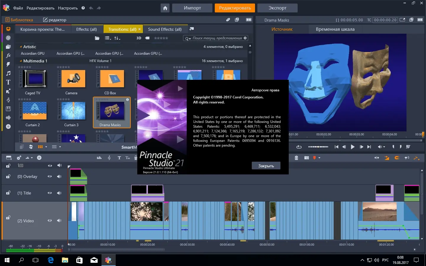 Видеоредактор Pinnacle Studio 21 Ultimate очень популярен среди тех, кто занимается созданием и монтажом видеоконтента любой сложности. Представленная обновлённая версия от мирового лидера в сфере профессиональных видеотехнологий компании Corel обладает высокой производительностью и расширенными возможностями. Скорость обработки в новой версии возросла до 10 раз благодаря обновлённому движку и поддержке технологий nVidia CUDA и Intel QuickSync. Программа позволяет реализовать самые смелые идеи благодаря богатой коллекции эффектов и контента, включающей более 2000 эффектов, а также возможностям создания настроенных титров и анимации в Hollywood-стиле.