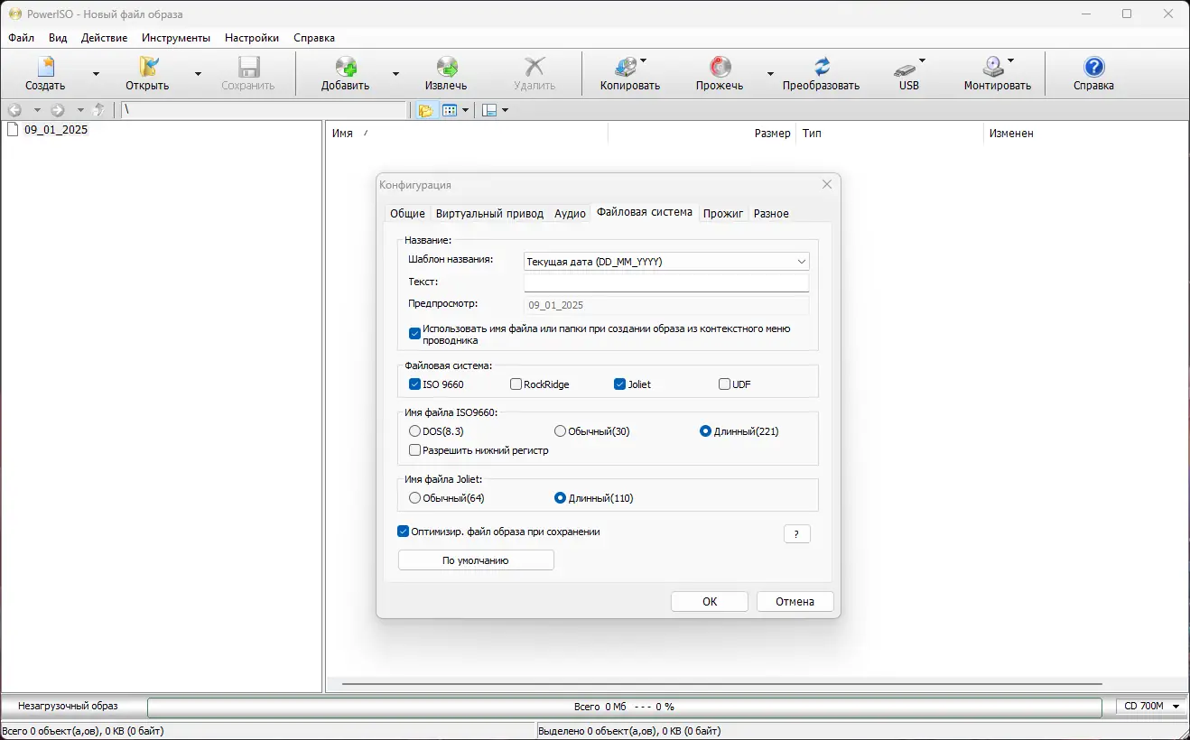 - Создание ISO-образов из файлов на жестком диске и CD/DVD дисков