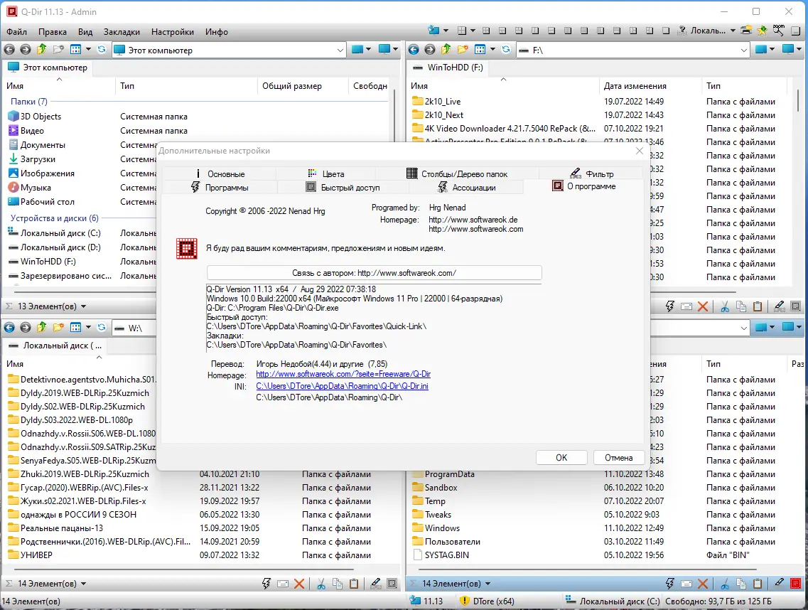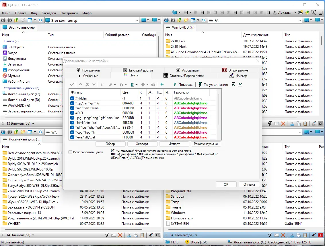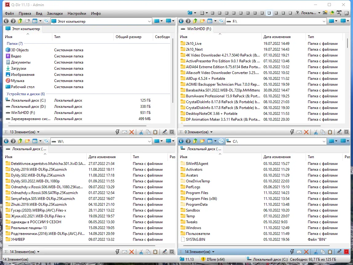 Q-Dir — это мощный файловый менеджер, отличающийся оригинальной четырехпанельной системой интерфейса, которая значительно облегчает работу с файлами и папками. Он работает с любого съемного устройства, включая USB-флешки, диски и сетевые ресурсы, и обладает многоязычным интерфейсом. Программа предоставляет быстрый доступ к часто используемым папкам с помощью специальных ссылок «Quick-Link’s», поддерживает drag&drop, интеграцию с буфером обмена и работу с разными типами папок: ZIP, FTP, системными, сетевыми и ярлыками. Встроенная функция предварительного просмотра файлов и просмотра изображений с «лупой» помогает быстро анализировать содержимое без открытия отдельных программ. Возможность выделения файлов цветом, фильтрации по типам и экспорта данных в форматы XLS, CSV, TXT и HTML делает работу максимально гибкой и удобной.
