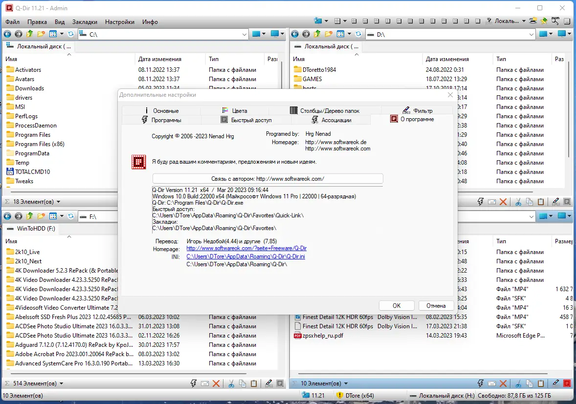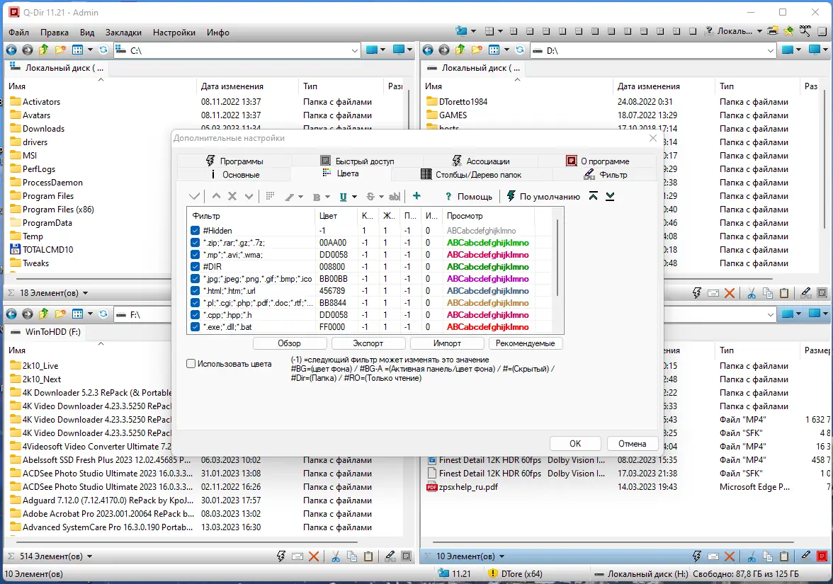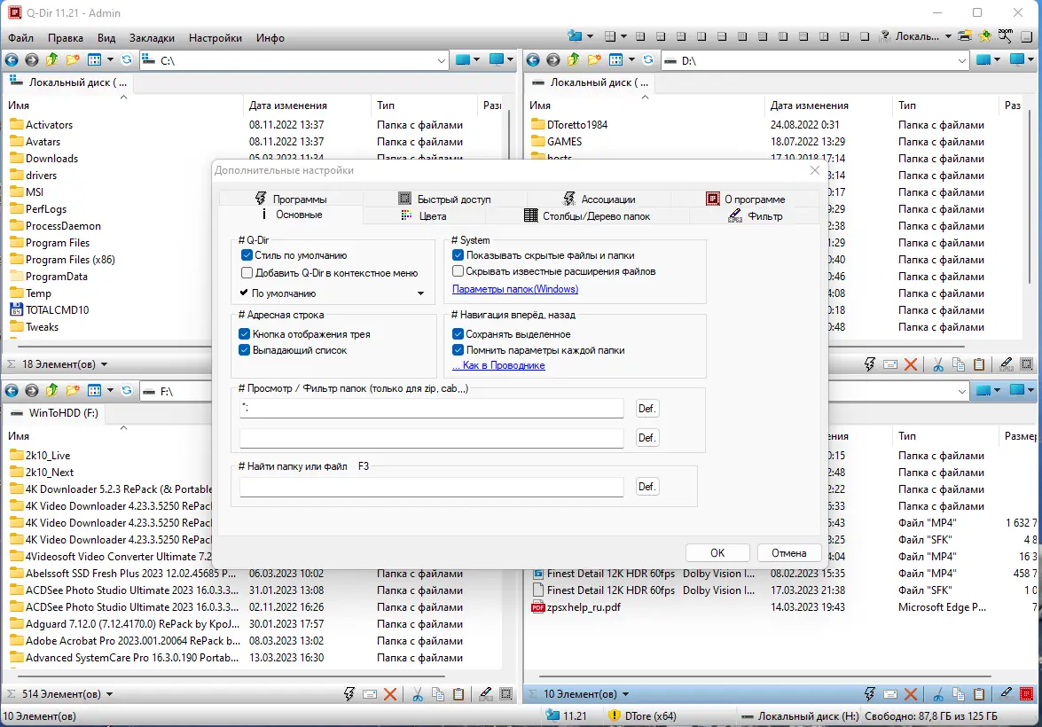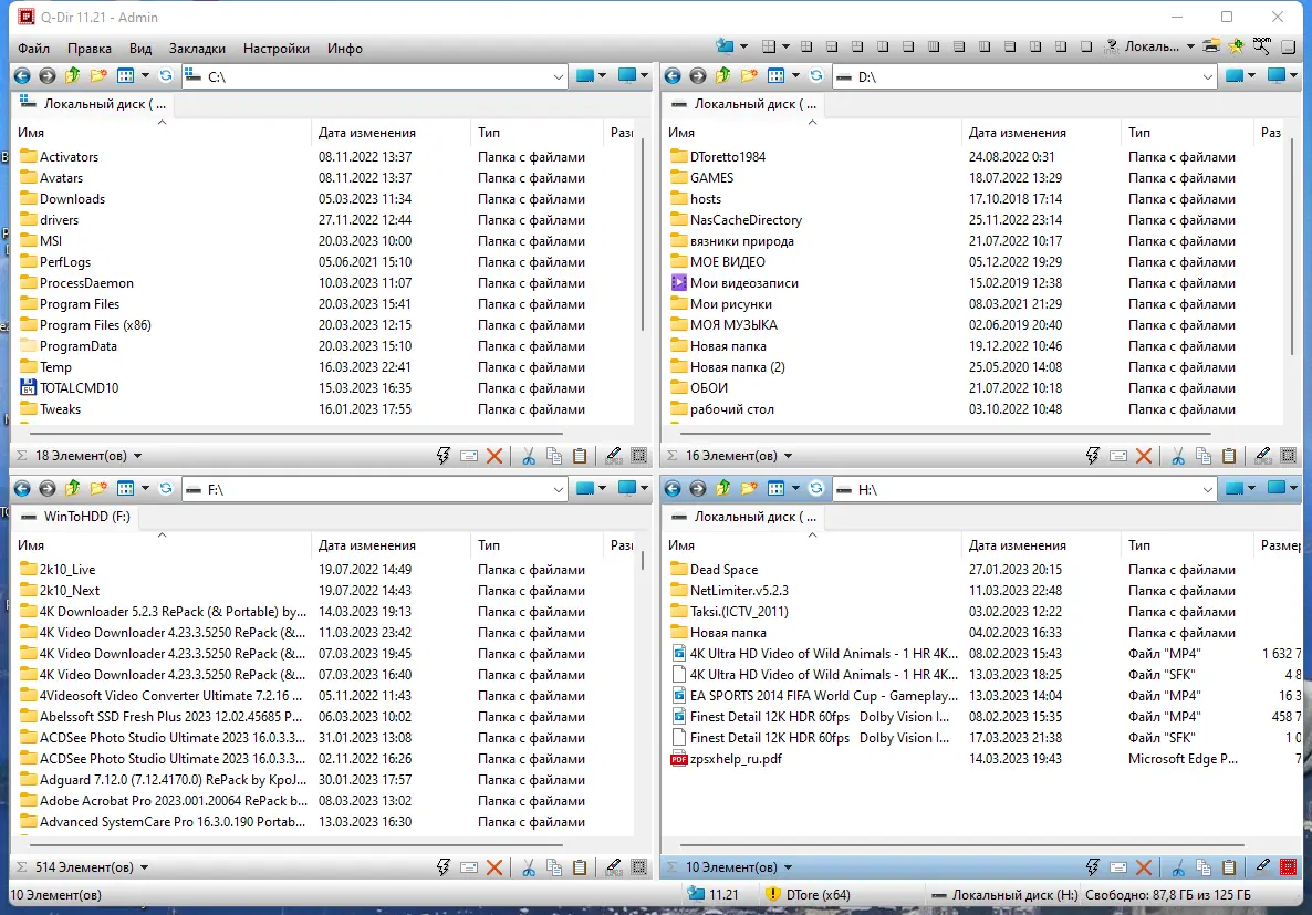 Q-Dir представляет собой мощный и универсальный файловый менеджер, который обеспечивает быстрый и удобный доступ к данным на жестких дисках, сетевых ресурсах, USB-устройствах и других съемных носителях. Благодаря оригинальному четырехпанельному интерфейсу он позволяет одновременно работать с несколькими папками, фильтровать файлы по типу, выделять их цветом, просматривать изображения с встроенной «лупой» и использовать режим предварительного просмотра. Поддержка ZIP, FTP, ярлыков и системных папок расширяет возможности управления файлами. Многоязычный интерфейс делает программу доступной для пользователей из разных стран.
