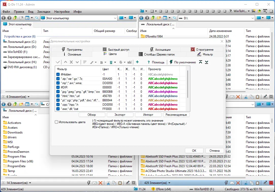 - Настройка цветовых меток для различных расширений файлов