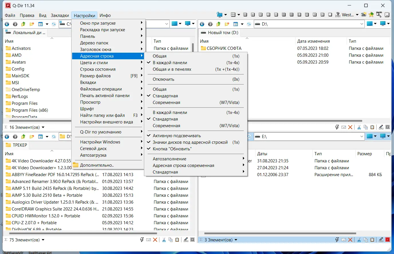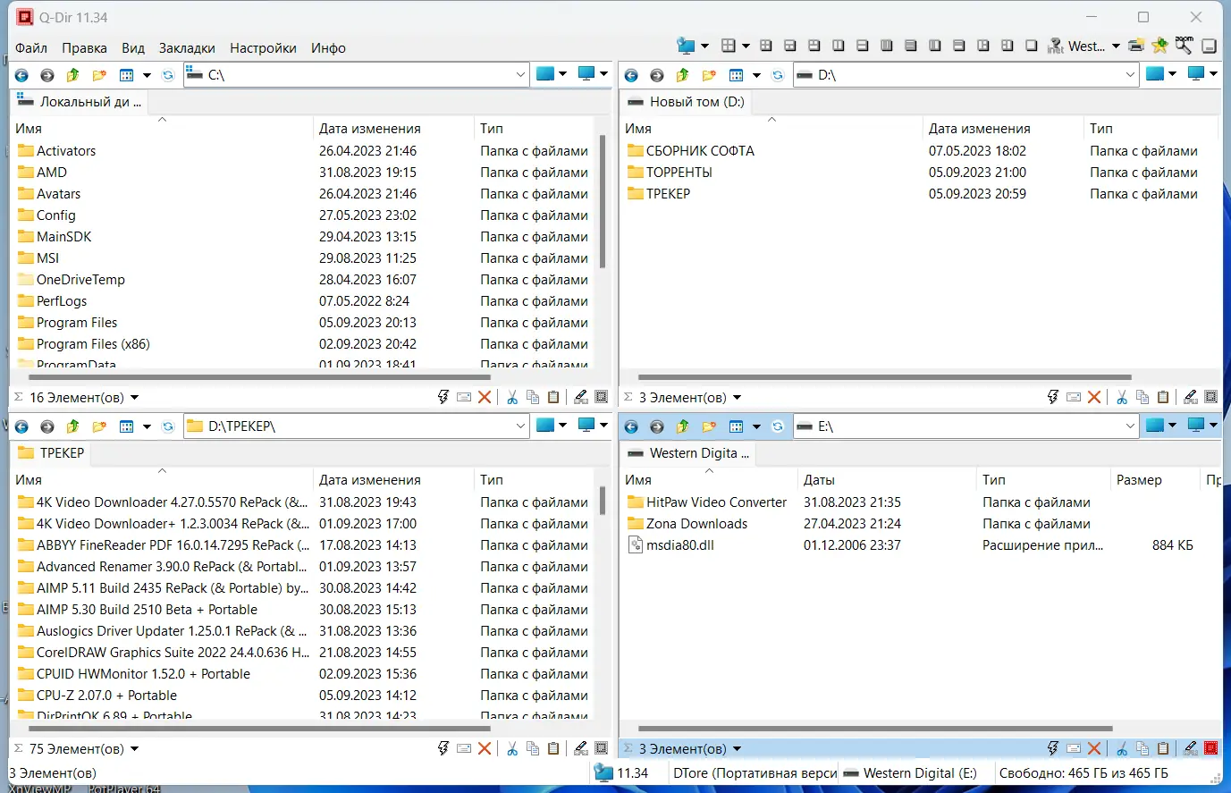 Файловый менеджер с четырехпанельным интерфейсом, обеспечивающий быстрый и удобный доступ к файлам и папкам с расширенными возможностями по их управлению.