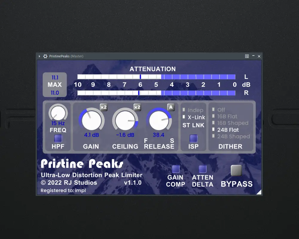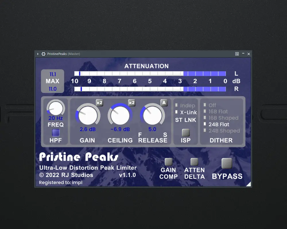 Pristine Peaks — это уникальный лимитер пиков с сверхнизким уровнем искажений, предназначенный для профессиональной обработки звука как при микшировании, так и при мастеринге. Он обеспечивает максимально прозрачное управление пиками сигналов, сохраняя качество звука и избегая нежелательных искажений даже при высоких уровнях и снижениях усиления.