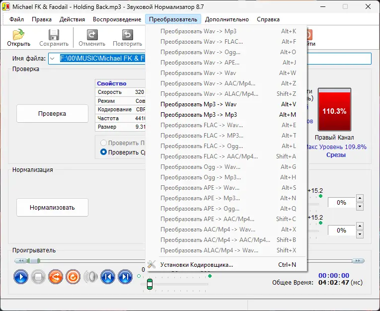 - Конвертация аудио между различными форматами с использованием современных кодировщиков;