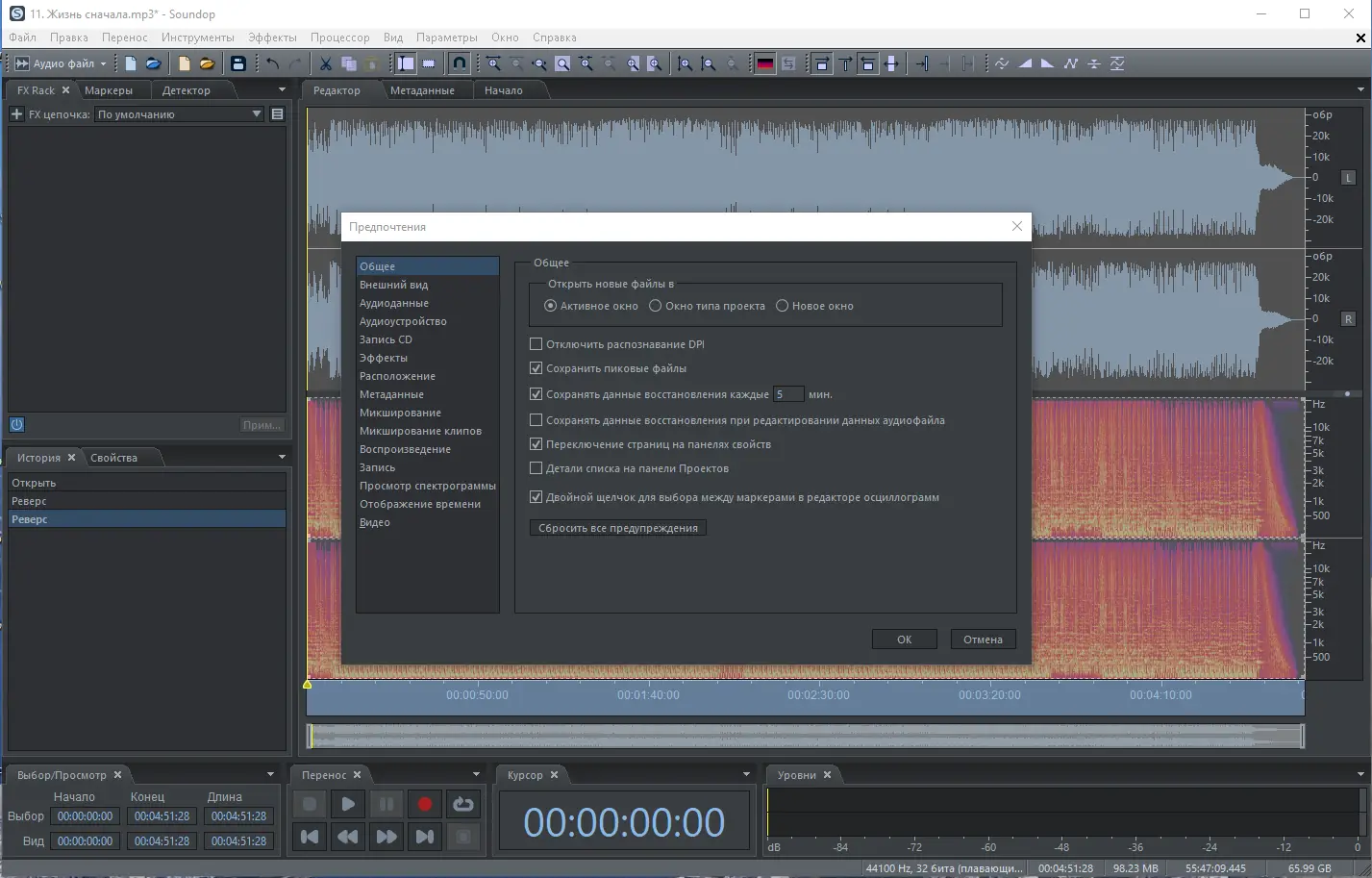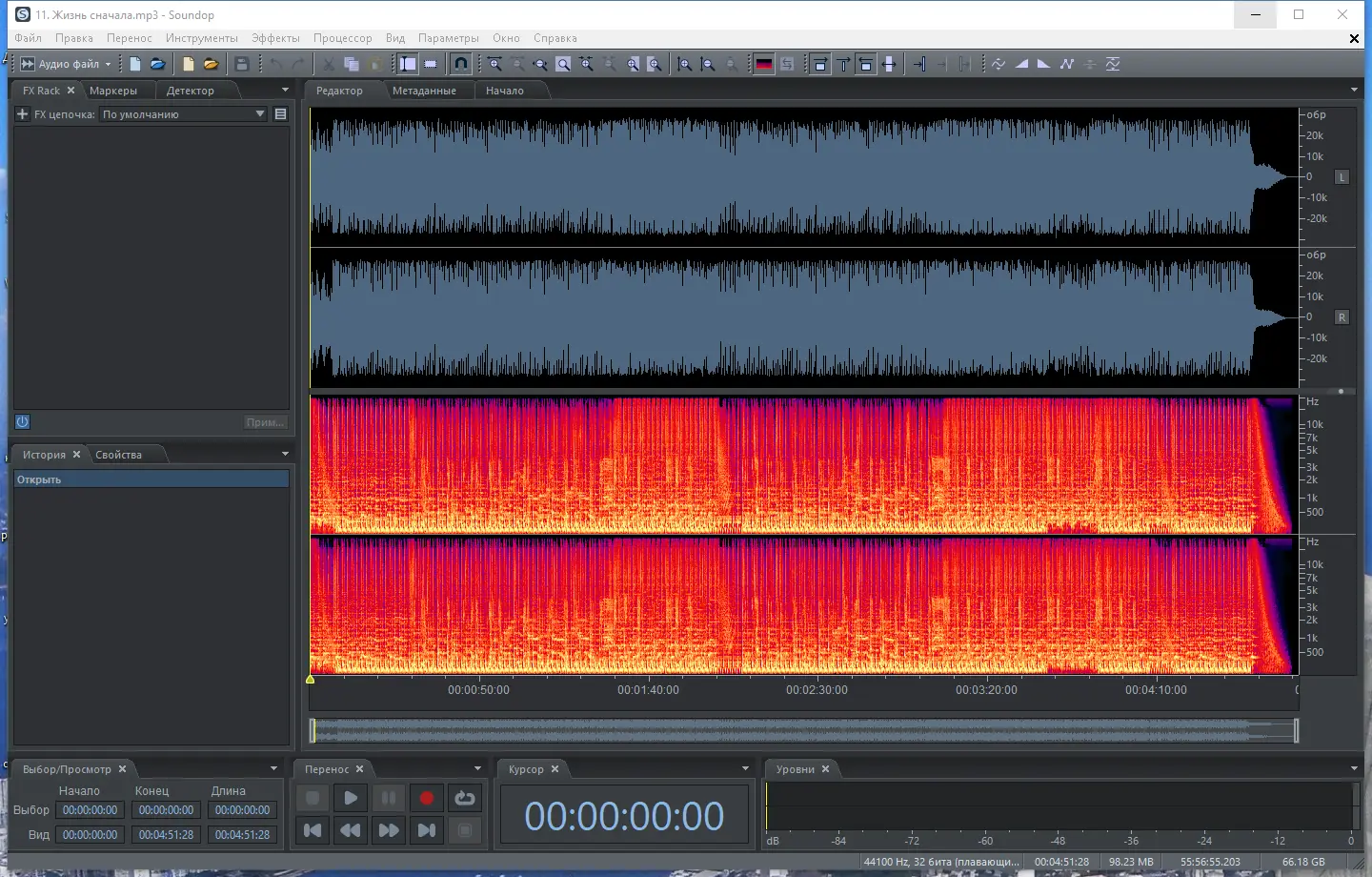 - Обработка звука с помощью спектральных инструментов, шумоподавления, усиления, нормализации и эффектов огибающей.