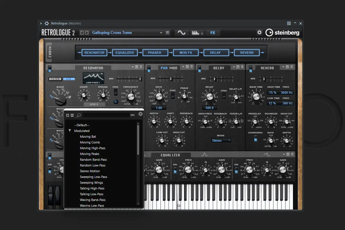 - Четыре полуволнных LFO плюс огибающие и матрица модуляции, поддерживающая Note Expression.