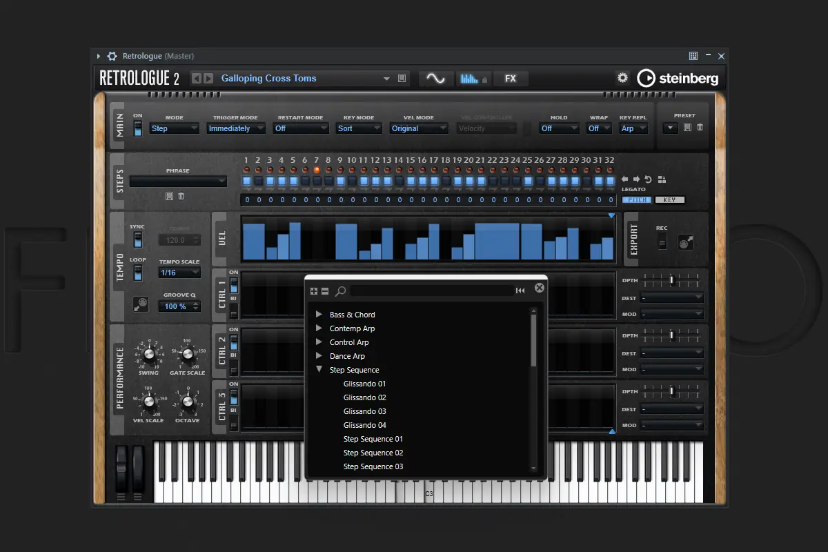 - 32-шаговый арпеджиатор с функцией “Export to host” и поддержкой драг-дроп назначения.