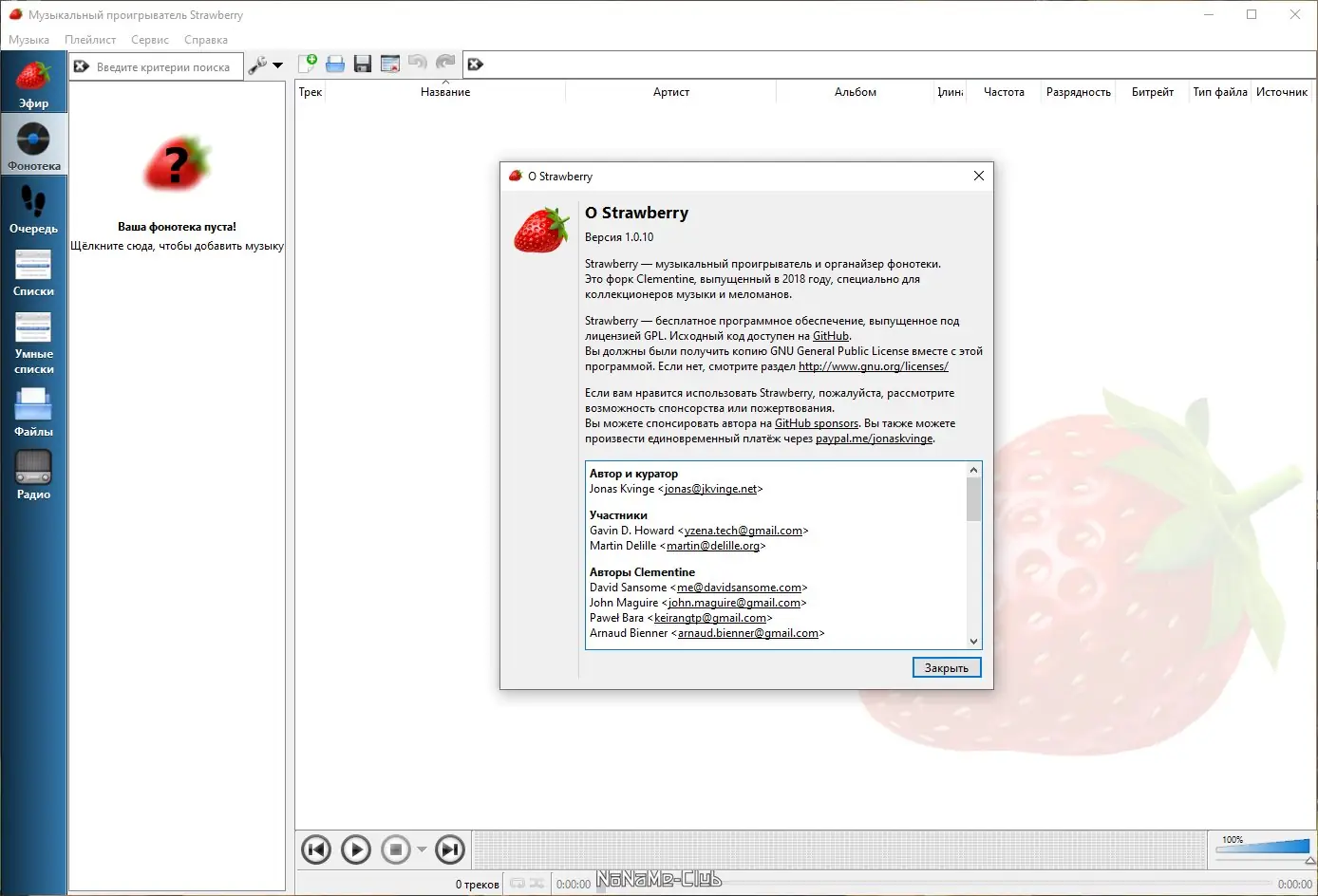 Strawberry — это современный музыкальный плеер и органайзер, который пришёл на смену популярному Clementine. Он позволяет воспроизводить и управлять вашими цифровыми музыкальными коллекциями, поддерживает множество популярных форматов, таких как MP3, FLAC, WAV, Opus, WavPack, Vorbis, MPC, TrueAudio, AIFF, MP4, ASF и Monkey’s Audio. Кроме того, программа способна воспроизводить аудио CD, работать с потоковым вещанием, а также взаимодействовать с радиостанциями и потоковыми сервисами. Благодаря автоматическому извлечению тегов из MusicBrainz и поддержке обложек альбомов с ряда онлайн-сервисов, Strawberry помогает вам лучше организовать свою коллекцию и наслаждаться музыкой максимально комфортно.