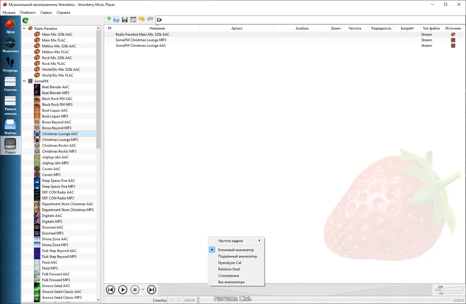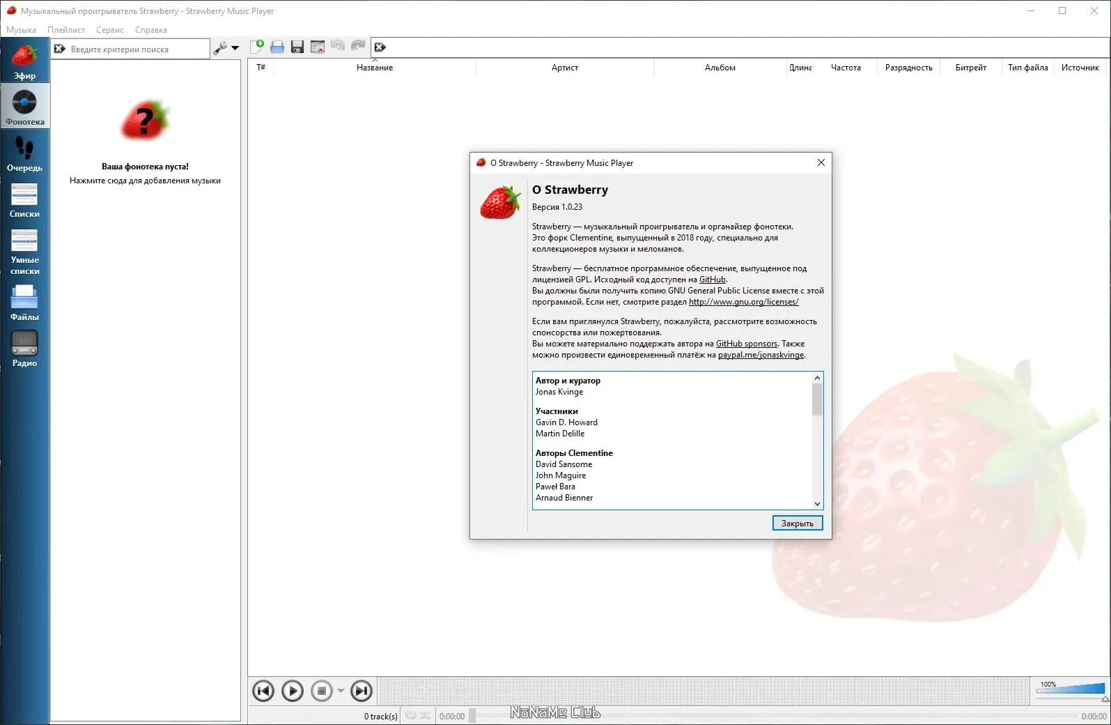 Strawberry — это мощный музыкальный плеер и органайзер, являющийся форком популярного аудио-плеера Clementine. Он предназначен для управления цифровыми музыкальными коллекциями, поддержки различных аудиоформатов и потокового вещания. Благодаря интеграции с такими сервисами, как Last.fm, Musicbrainz, Discogs и другими, программа обеспечивает высокий уровень автоматизации пазлов с тегами, обложками и текстами песен. В дополнение к воспроизведению музыки, программа поддерживает воспроизведение аудио-CD, управление плейлистами и настройку аудиовыхода.