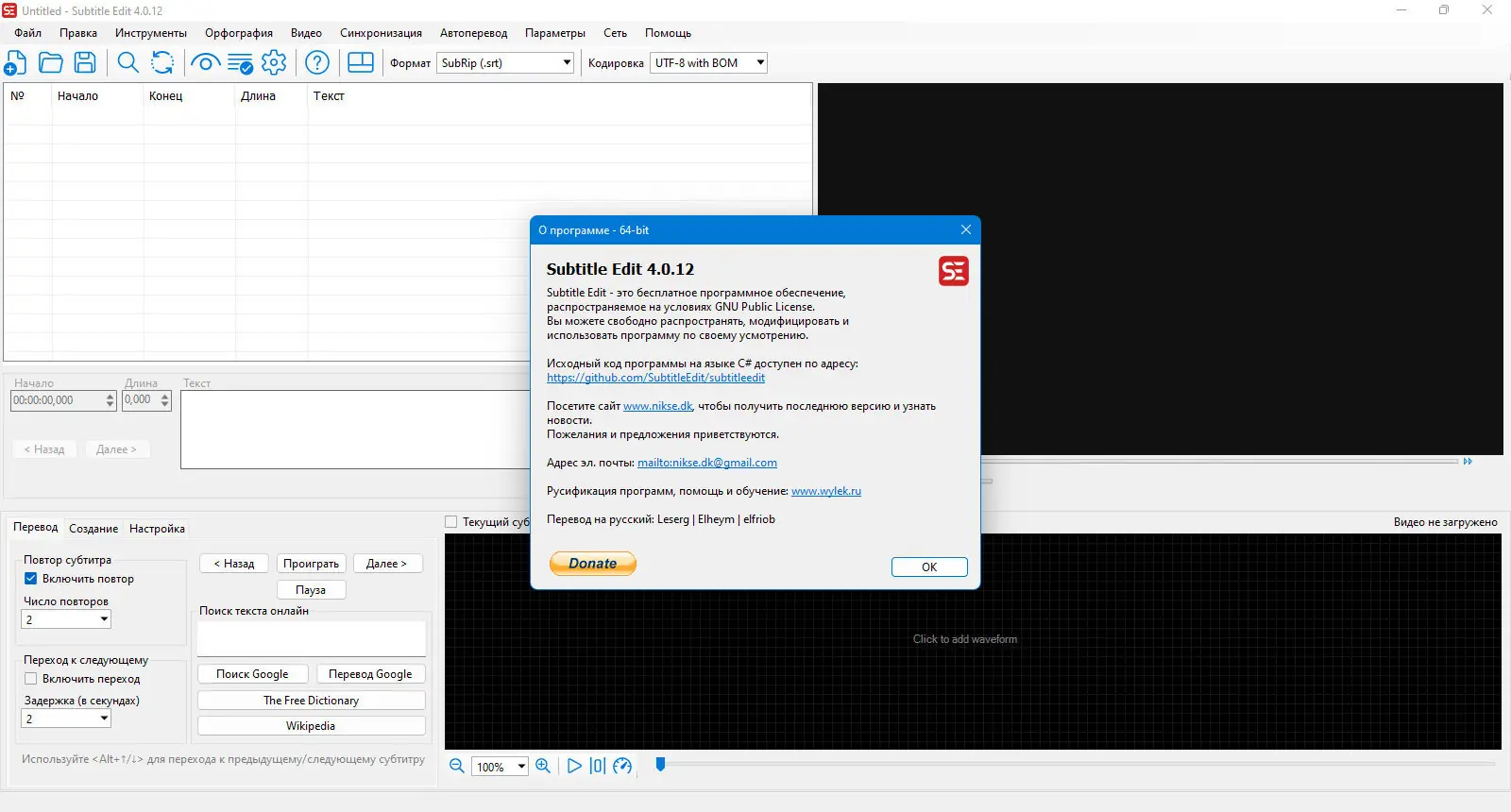 Subtitle Edit — это мощная программа для редактирования и создания субтитров. Она обеспечивает удобный инструмент для синхронизации, конвертации и улучшения качества субтитров, а также поддерживает импорт и экспорт в более 200 форматов.