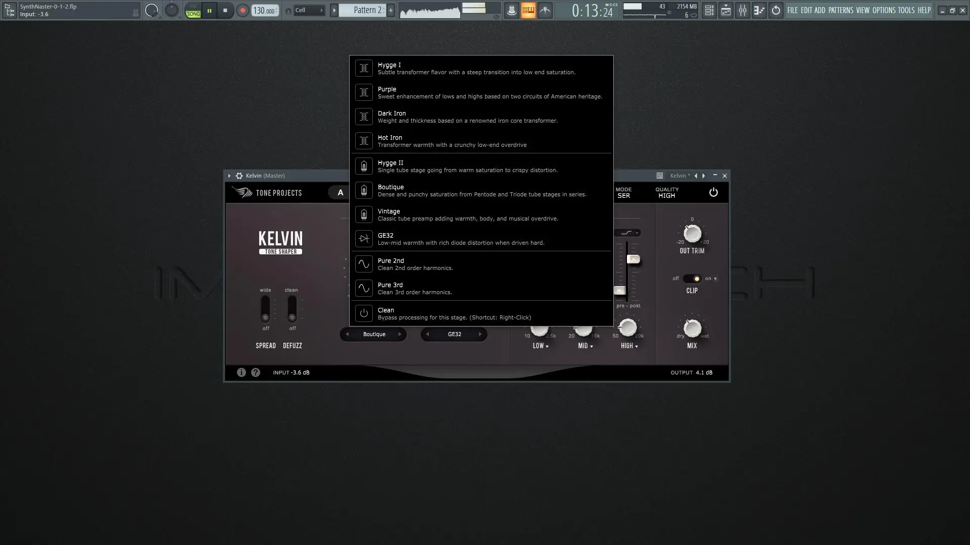 Kelvin сочетает в себе гибкую двухступенчатую сатурацию с мощным двухтактным эквалайзером, создавая новый вдохновляющий способ моделирования звука. Обманчиво простой в использовании интерфейс скрывает богатство возможностей: вы можете управлять моделями насыщения, выбирая среди нескольких трансформаторных, ламповых и диодных схем, чтобы добиться насыщенной гармонической окраски и теплоты. Благодаря тщательно настроенным алгоритмам и высокой точности переработки сигналов, Kelvin способен от тонкой окраски до мощного искажения, сохраняющего музыкальность.