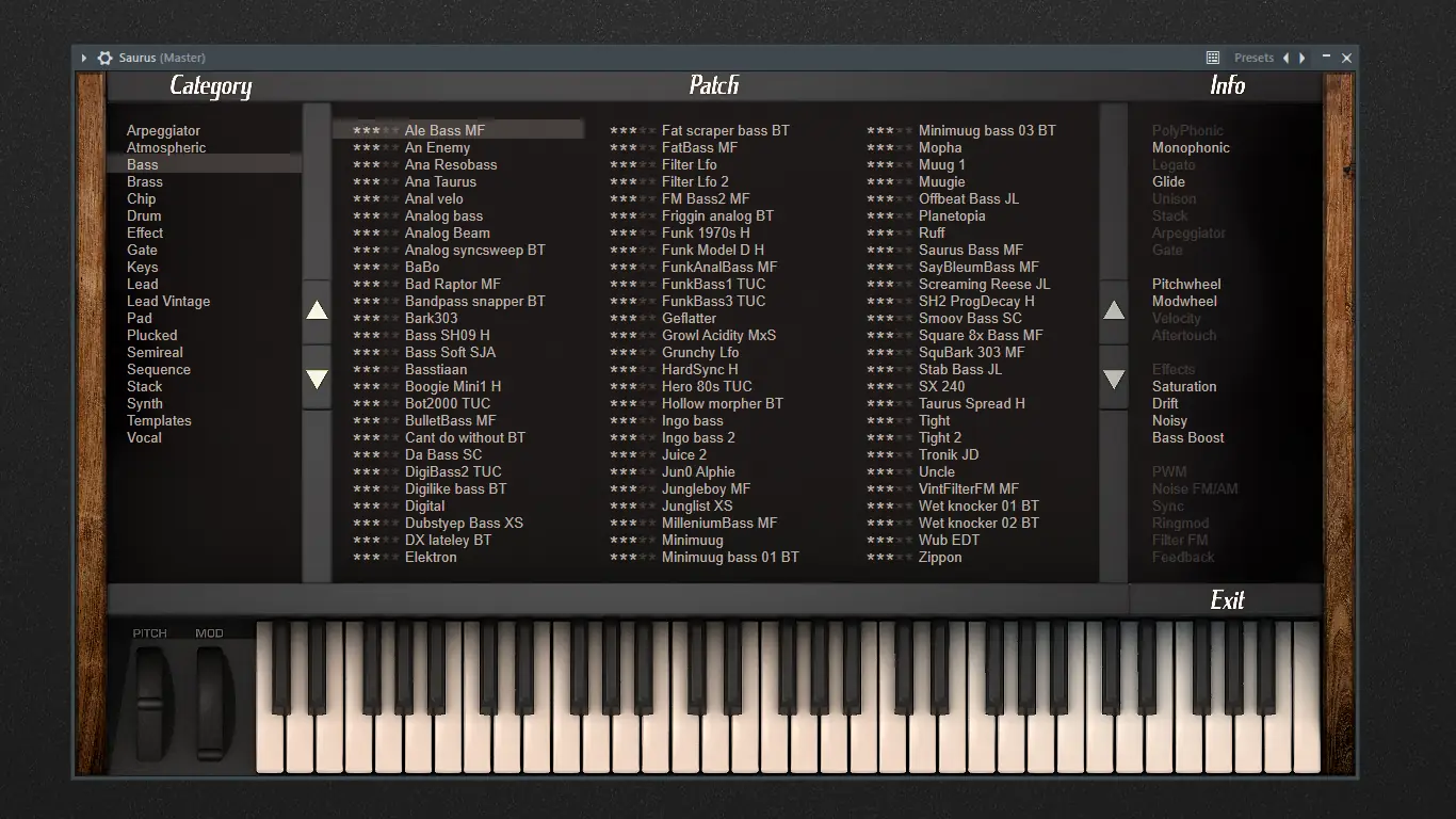 Tone2 — Saurus — это синтезатор, основанный на передовой технологии моделирования аналоговых схем, которая позволяет добиться высокого уровня аутентичности звучания без недостатков аналогичных устройств. В процессе разработки были изучены и проанализированы схемы нескольких знаменитых синтезаторов, что позволило максимально приблизить латентность и отклики оригинального оборудования. Оснащён высококачественными осцилляторами, мощной секцией фильтров, расширенными возможностями модуляции и продвинутым арпеджиатором, данный инструмент подарит музыкантам и звукорежиссерам широчайшие возможности по формированию уникальных звуковых ландшафтов. Помимо этого, в комплект входит 1022 пресета от профессиональных специалистов, что позволит быстро создавать высококлассные композиции сразу после установки.