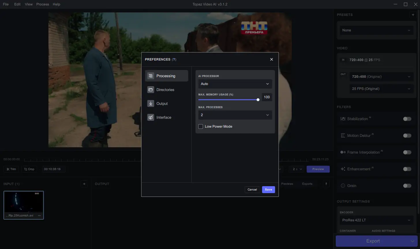 - Улучшение видео до разрешения 8K, увеличение детализации и четкости