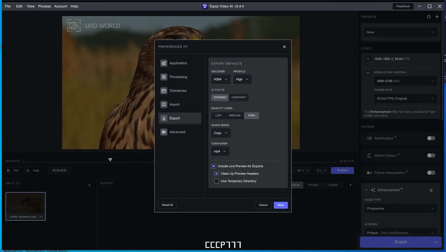- Улучшение кадров до разрешения 8K с сохранением деталей и плавности движения.