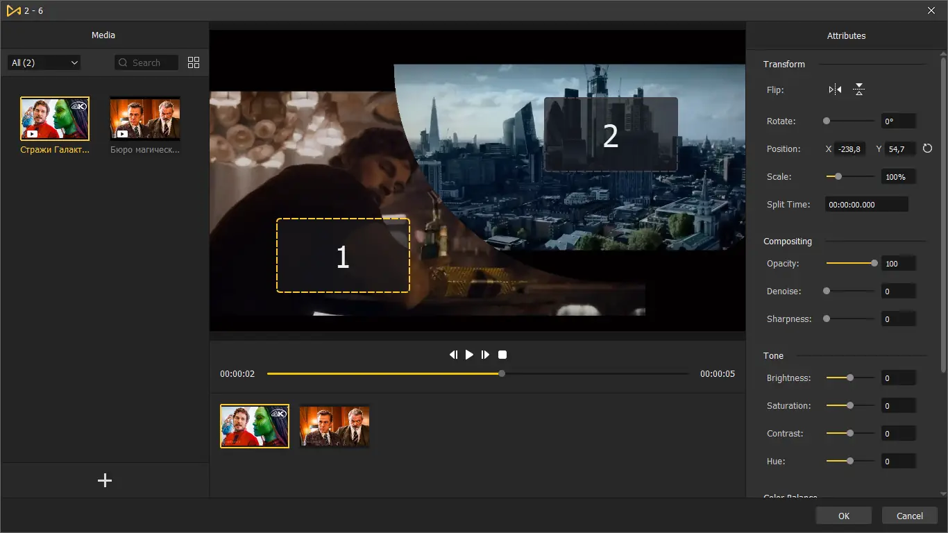 - Множество расширенных эффектов, переходов и инструментов для профессиональной обработки.