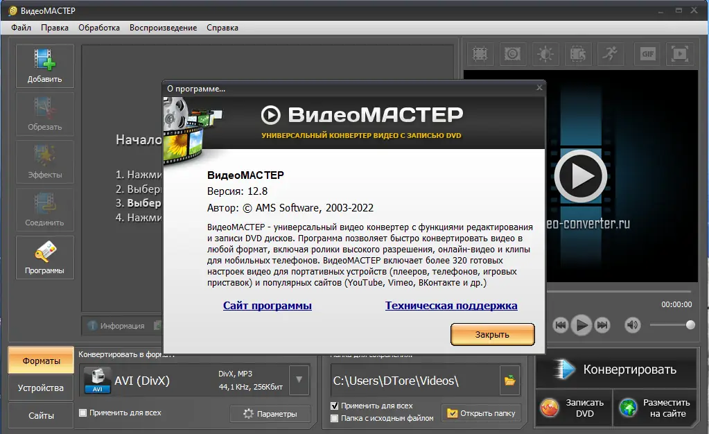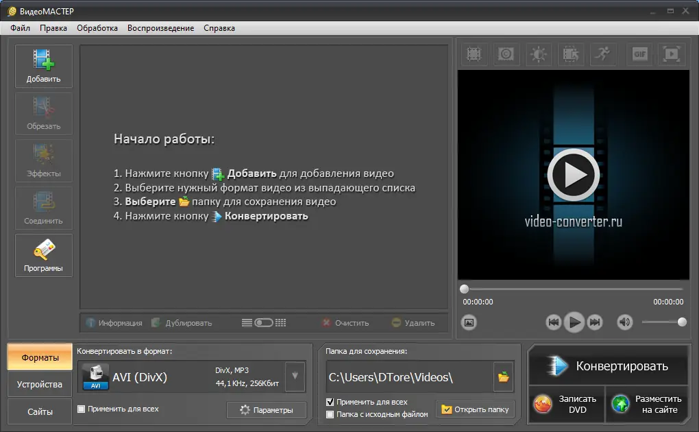 ВидеоМАСТЕР — универсальный видео конвертер с возможностью записи DVD дисков, предлагающий быстрый и удобный способ преобразования видео в различные форматы, включая высокое разрешение и онлайн-видео. Программа отлично подходит для обработки видео под мобильные устройства, плееры, а также публикации на популярных сайтах, таких как YouTube, Vimeo и ВКонтакте.