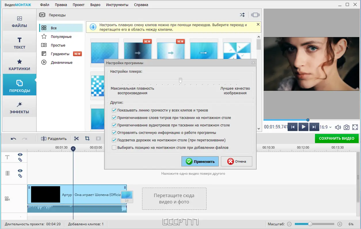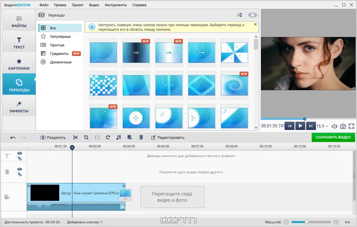 ВидеоМОНТАЖ — это невероятно доступный и удобный видеоредактор, позволяющий с лёгкостью создавать эффектные видеоролики и увлекательные фильмы в домашних условиях. Всего за 5 шагов вы получите отличное видео с красивыми переходами, титрами, эффектами и фоновой музыкой. Интерфейс на русском языке делает обучение максимально простым, а поддержка самых популярных форматов гарантирует совместимость с любыми устройствами. Благодаря встроенной коллекции фильтров, эффектов и шаблонов титров, каждый пользователь сможет создать профессиональное видео без специальных навыков. Возможности программы позволяют не только монтировать видео, но и экспортировать результат в формат HD или Full HD, записывать на DVD или публиковать в интернете.
