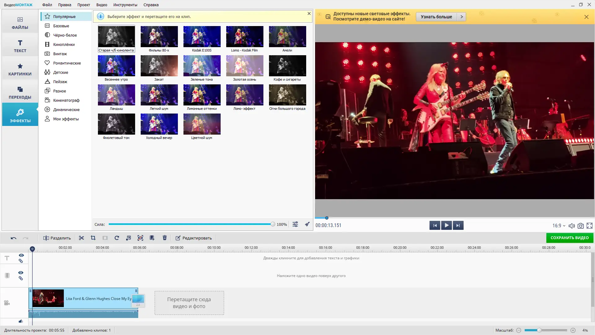 - Большой каталог эффектов, переходов, титров и заставок