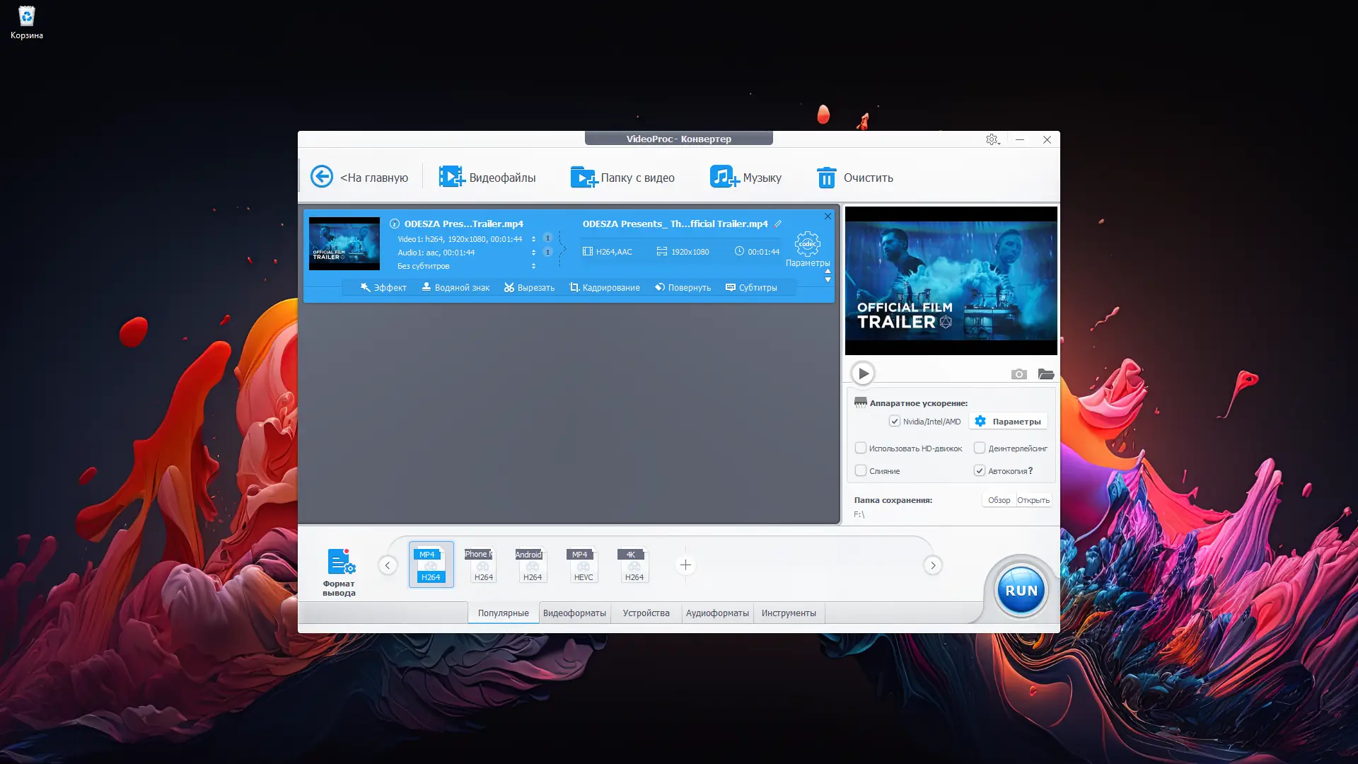 - Полное аппаратное ускорение для сверхбыстрой обработки за счет GPU (Intel QSV, NVIDIA CUDA/NVENC, AMD)
