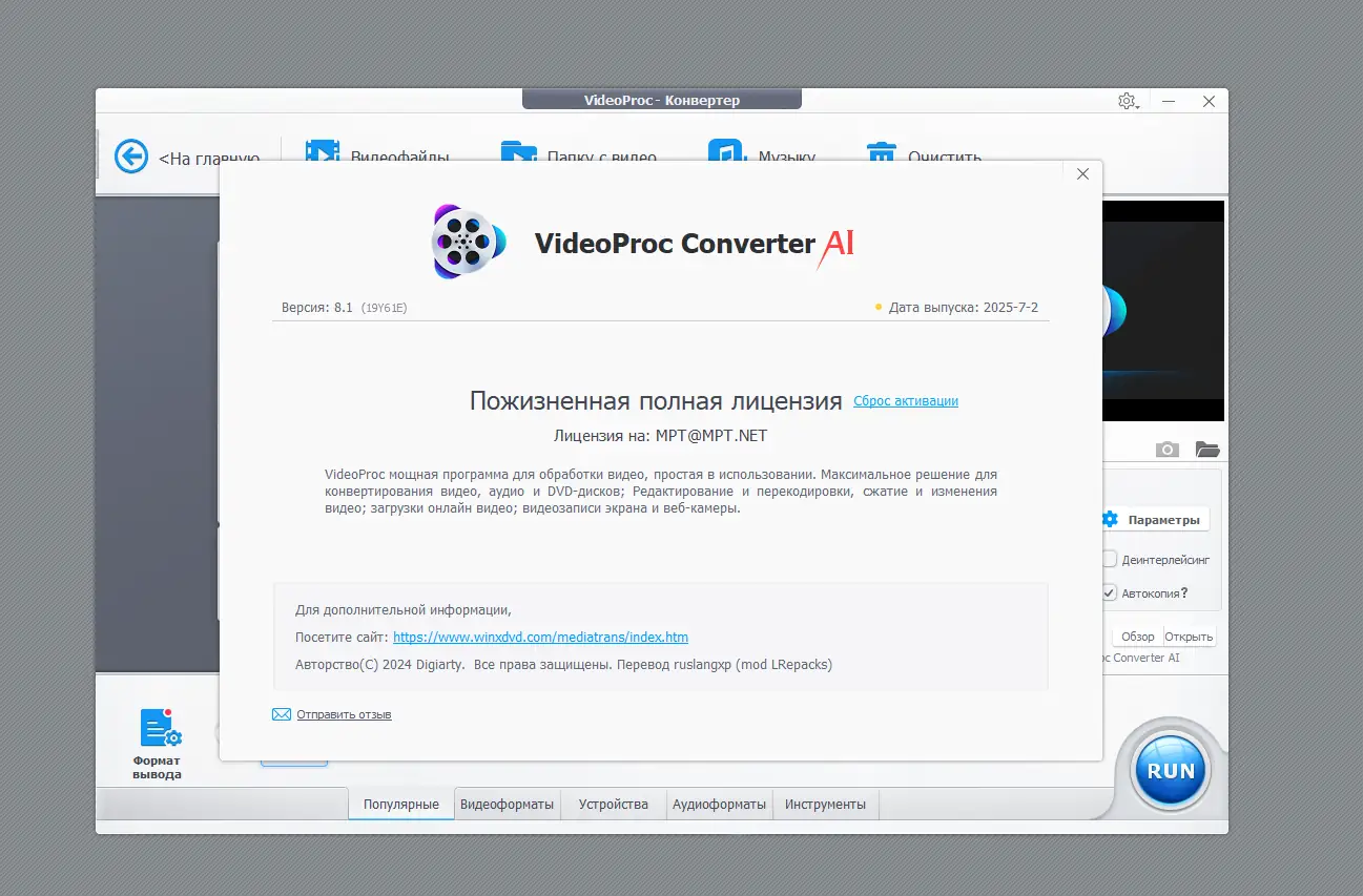 Обладая простым и удобным интерфейсом, она подходит как для профессионалов, так и для домашних пользователей, позволяя легко выполнять сложные задачи по обработке видеоконтента без необходимости дополнительных программ. Программа также включает загрузчик онлайн видео и аудио, видеорекордер для записи с экрана или веб-камеры, а также DVD риппер для копирования и конвертирования DVD-дисков. Учтите, что при установке может появляться предложение посетить сайт автора репака — это по желанию, и его можно снять с галочкой, чтобы избежать ненужных перенаправлений.