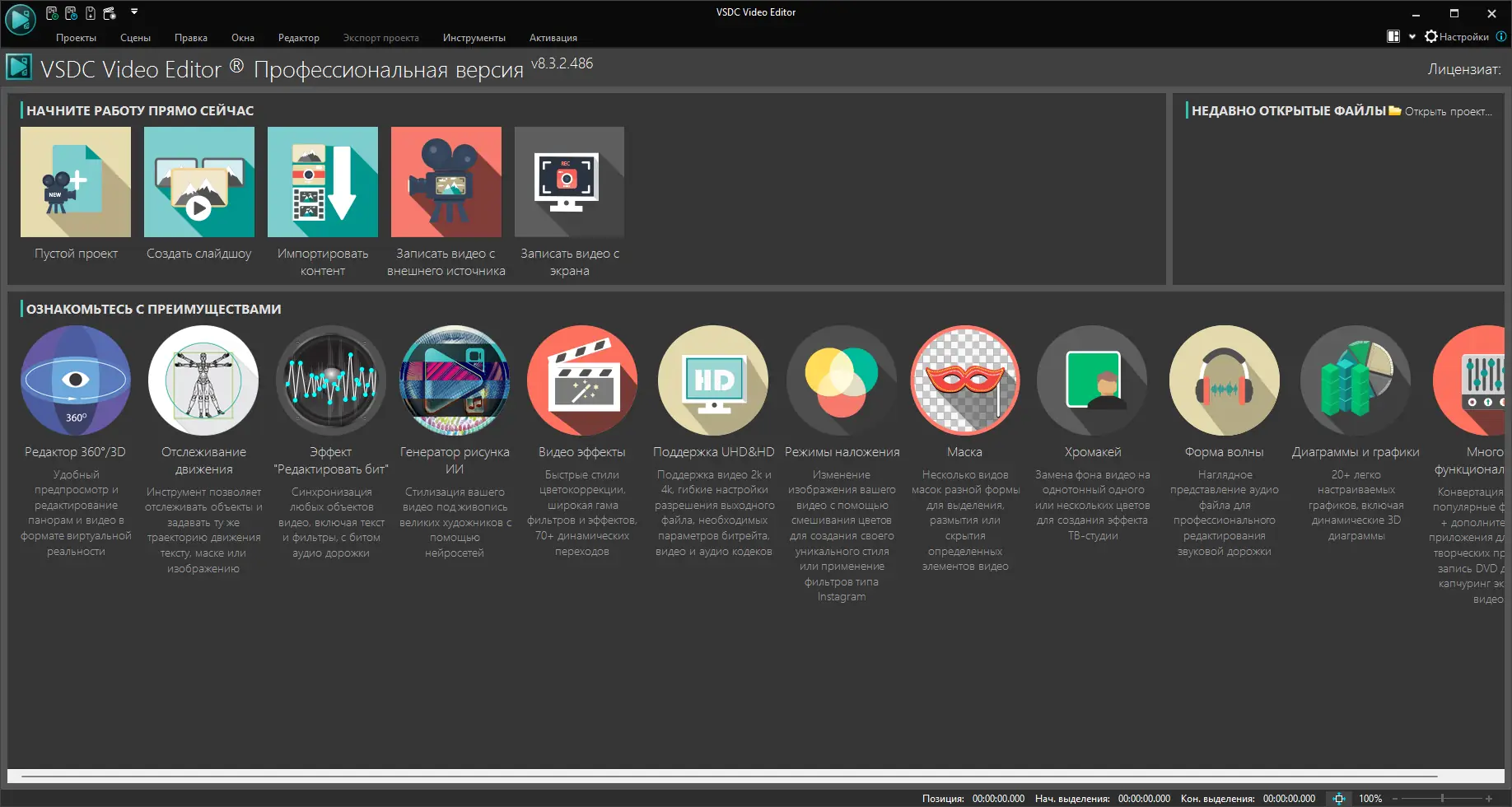 Если вы ищете программу для монтажа видео, которая сочетает в себе мощные возможности и доступность по системным требованиям, VSDC Pro станет отличным выбором. В отличие от дорогостоящих решений, он идеально подходит как для опытных профессионалов, так и для новичков. Встроенные инструменты позволяют реализовать широкий спектр задач — от базовой коррекции цвета до создания эффектов с помощью искусственного интеллекта и анимации. Более того, программа отлично справляется с обработкой видео 360°, стабилизацией, наложением эффектов и созданием киноэффектов, что делает её универсальным инструментом для видеомонтажа.