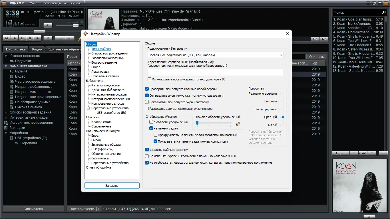 - Модуль визуализации и расширенные настройки звука, включая эквалайзер и ReplayGain.