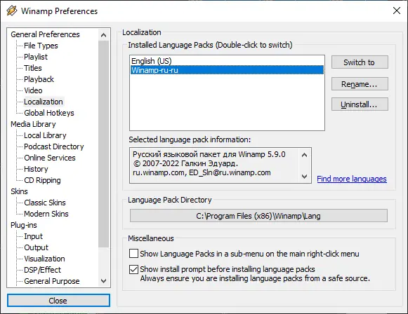 Winamp — легендарный аудиоплеер, который был широко распространён с конца 90-х до начала 2000-х годов и остаётся популярным среди энтузиастов. Он поддерживает воспроизведение множества форматов аудио и видео, обладает широкими возможностями кастомизации и удобным интерфейсом. Программа доступна бесплатно и может быть установлена как на 32-х, так и на 64-х битных версиях Windows, включая Windows 7, 8/8.1, 10 и 11.