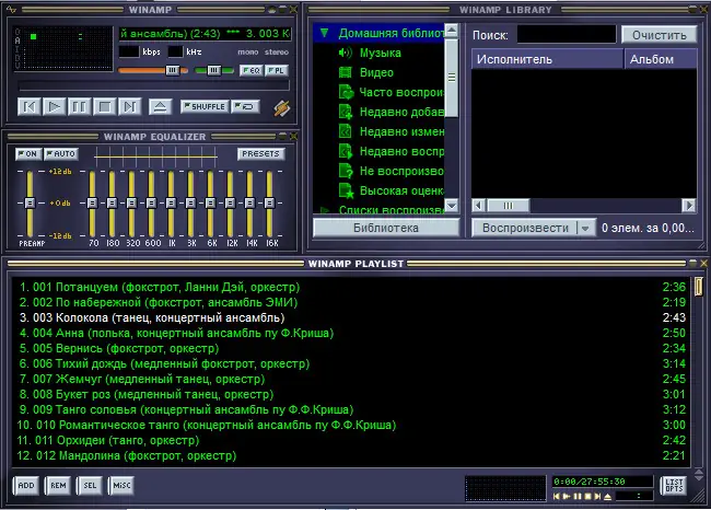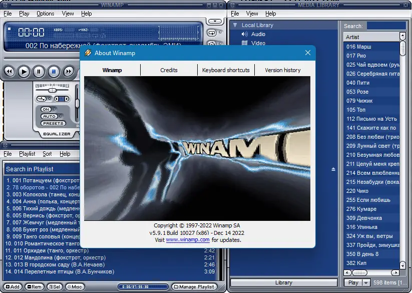 Winamp — легендарный аудиоплеер, который был широко распространён на большинстве компьютеров конца 90-х — начала 2000-х годов. Он обеспечивает воспроизведение множества аудиоформатов и поддерживает видео, предоставляя пользователям разнообразные инструменты для настройки и персонализации воспроизведения.