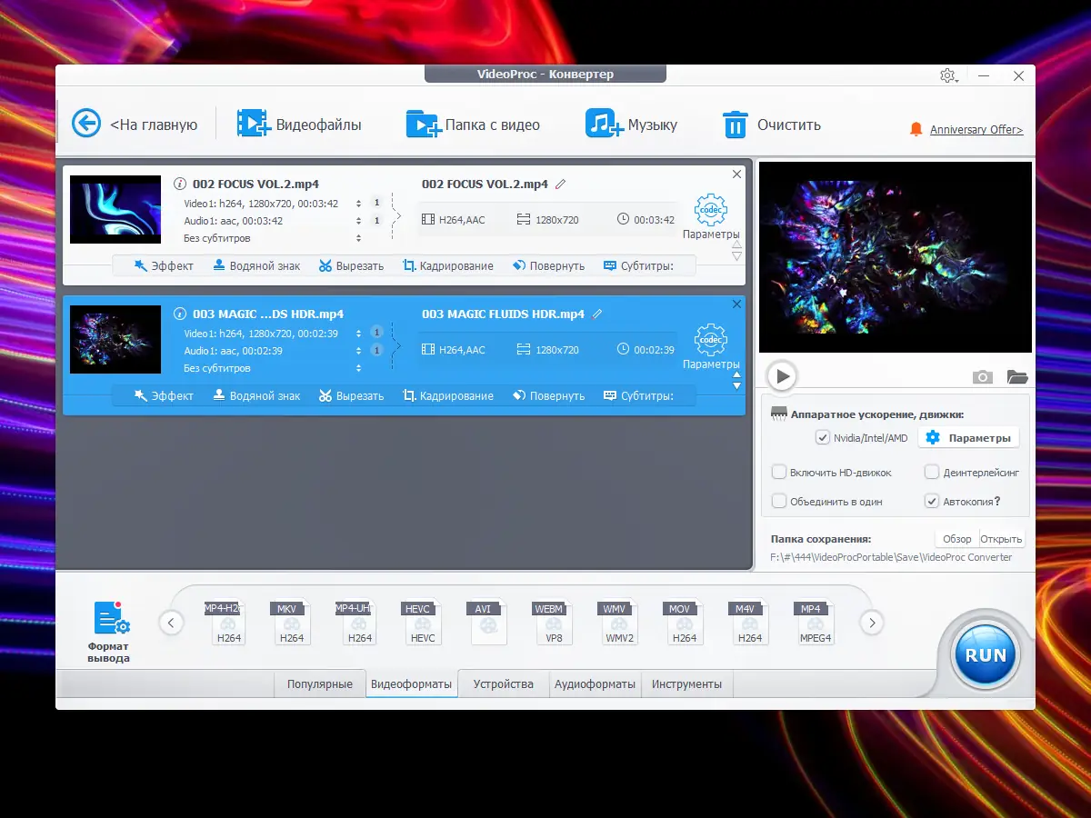 - Конвертация видео в форматы AVI, MP4, MOV, MKV, AVI, WMV и другие.