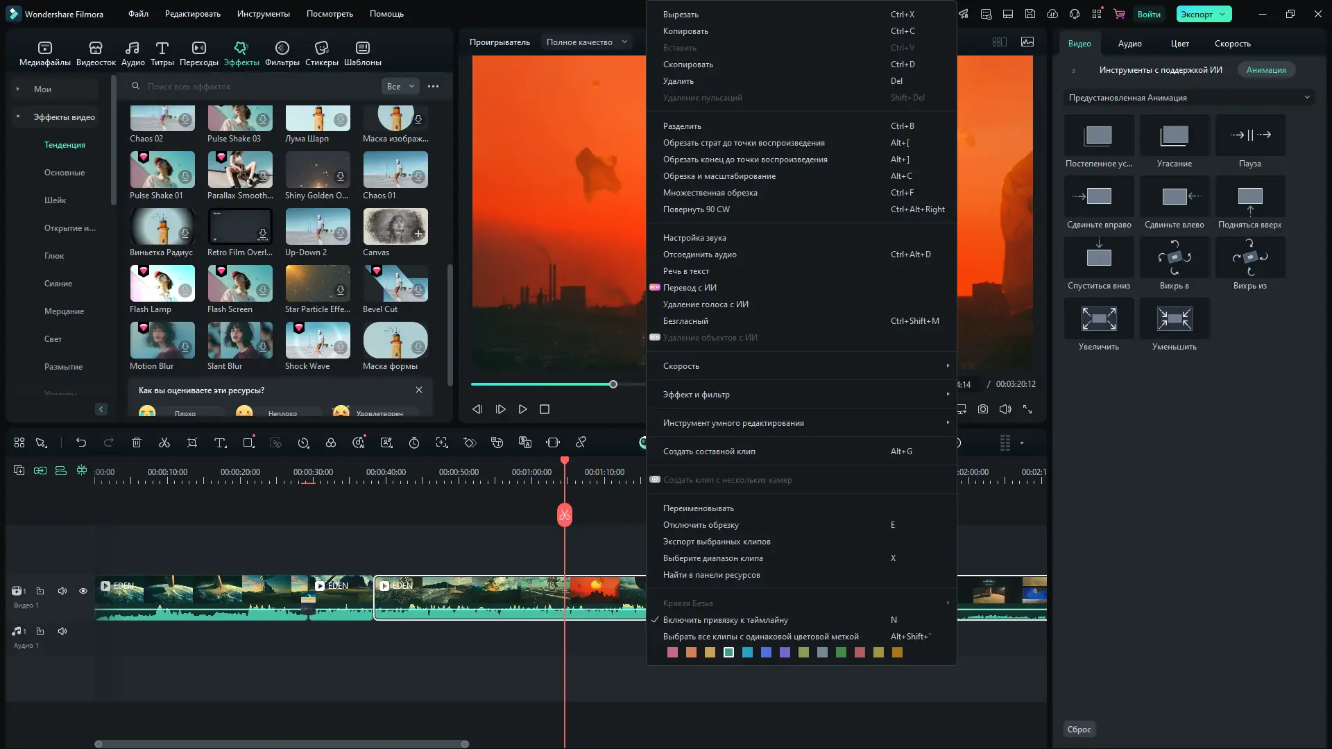 - Большой набор эффектов, шаблонов и инструментов AI для автоматизации монтажа