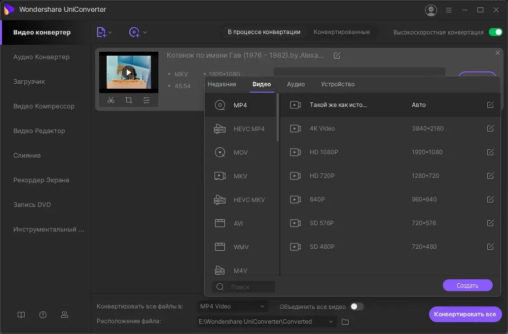 - Высокая скорость конвертации с аппаратным ускорением