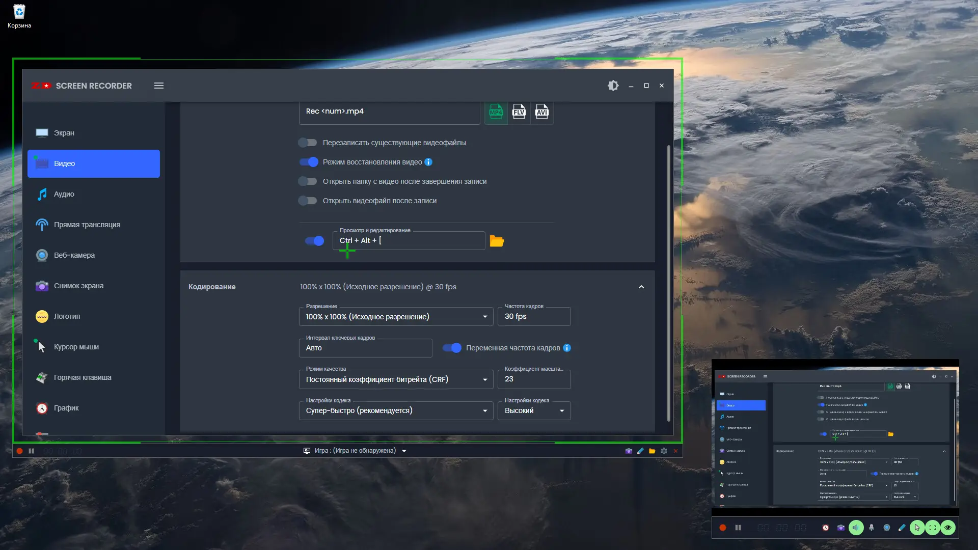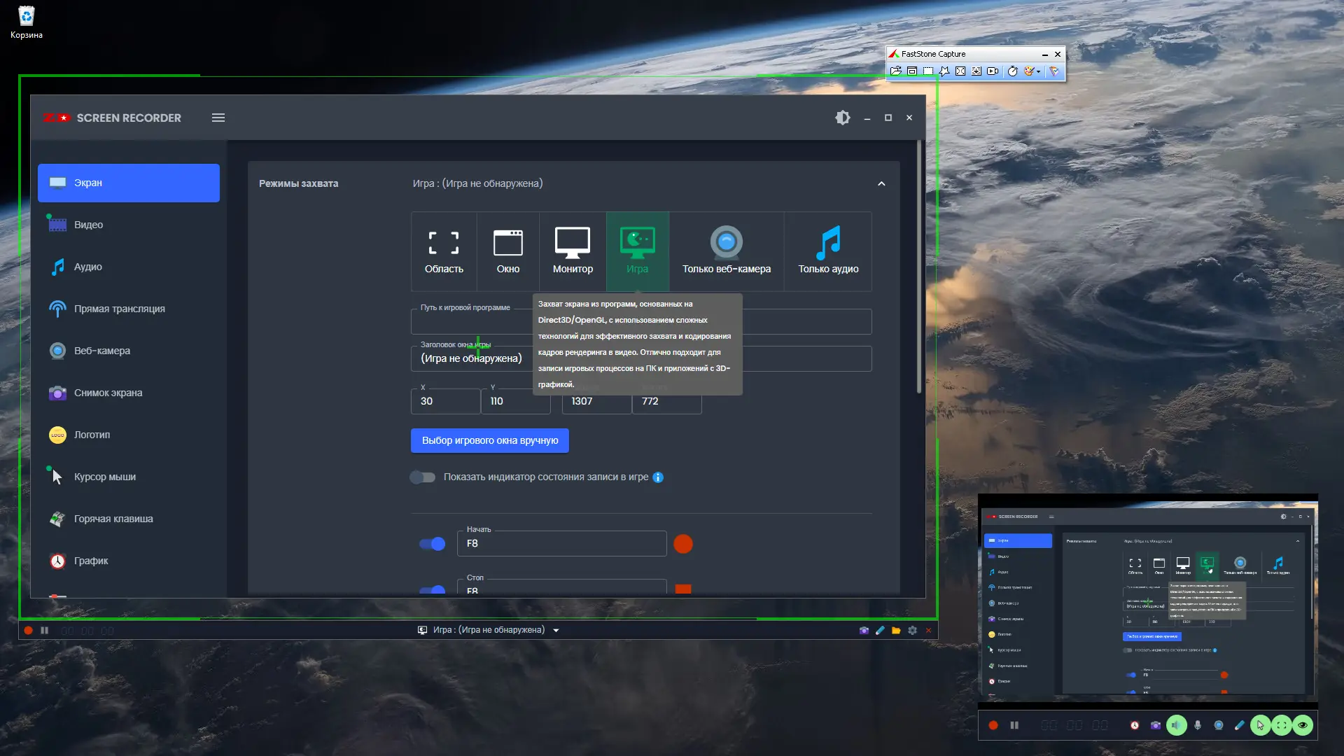 - Поддержка записи игр в полноэкранном и оконном режимах.