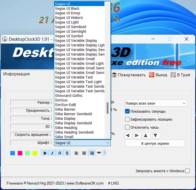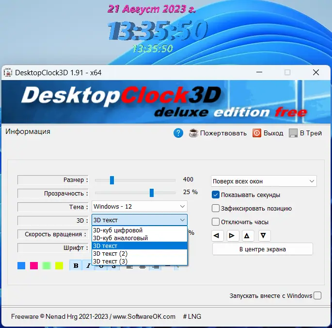 DesktopClock3D — это простая в освоении, однако весьма привлекательная утилита, которая отображает часы в трехмерном формате прямо на рабочем столе Windows. Благодаря богатому набору настроек, пользователи могут подстроить внешний вид и поведение часов так, чтобы они идеально вписывались в интерьер рабочего пространства. В программу входит множество тем, есть поддержка различных шрифтов, а также возможность изменения размера, положения и прозрачности элементов времени. Дополнительный дисплей секунд позволяет более точно следить за временем, а необходимые настройки легко осуществлять через интерфейс программы.