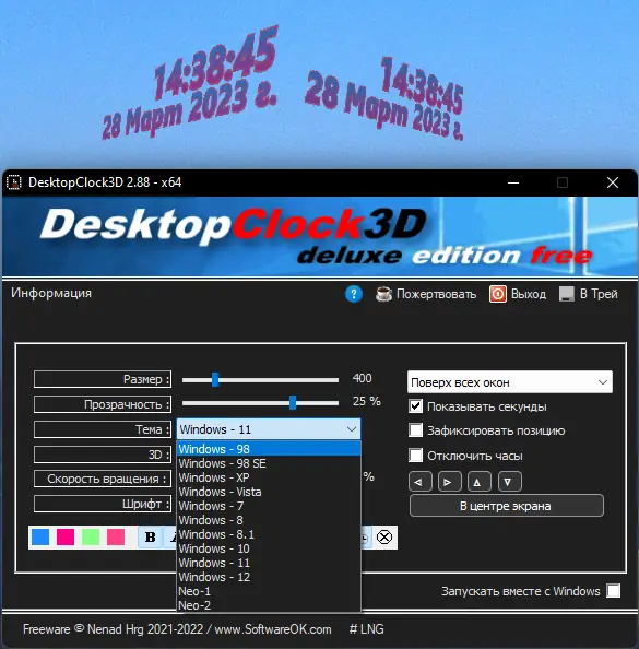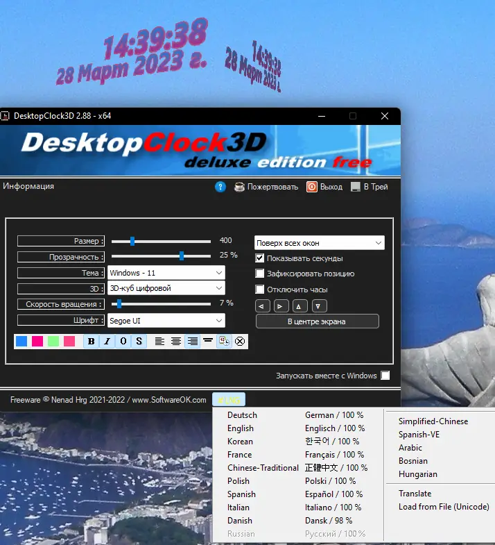 DesktopClock3D — это легкое и стильное приложение для отображения 3D часов на рабочем столе Windows, которое отличается простотой использования и высокой настраиваемостью.