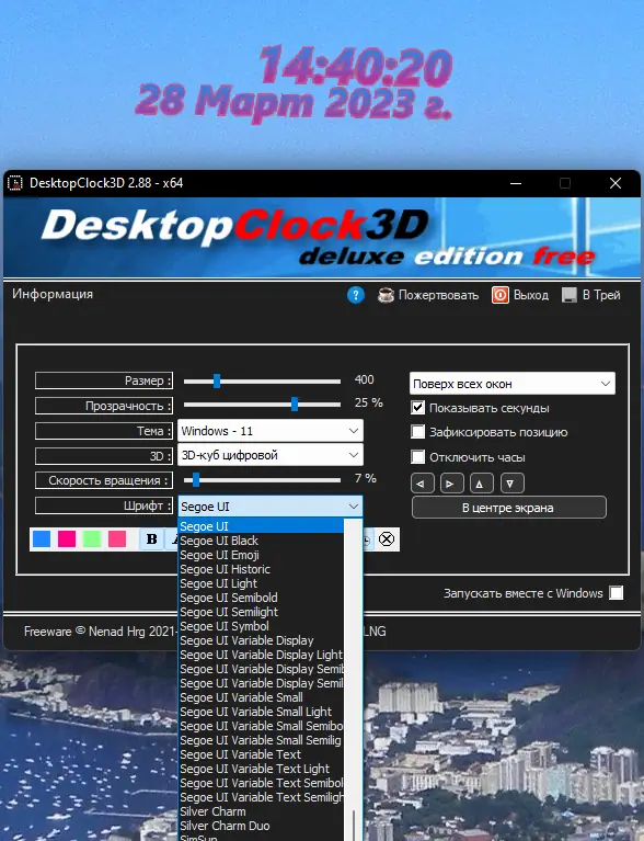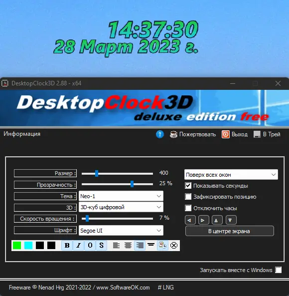 Программа DesktopClock3D представляет собой красивые трехмерные часы, предназначенные для оформления рабочего пространства Windows. Благодаря разнообразию шрифтов, тем и индивидуальных настроек, вы можете адаптировать их под свой стиль. Надежна и не нагружает ресурсы системы, поддерживая работу на различных версиях Windows, включая 7, 8/8.1, 10 и 11. Портативные версии позволяют использовать программу без установки, что особенно удобно для мобильных пользователей и тех, кто ценит быстроту запуска.