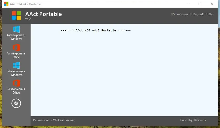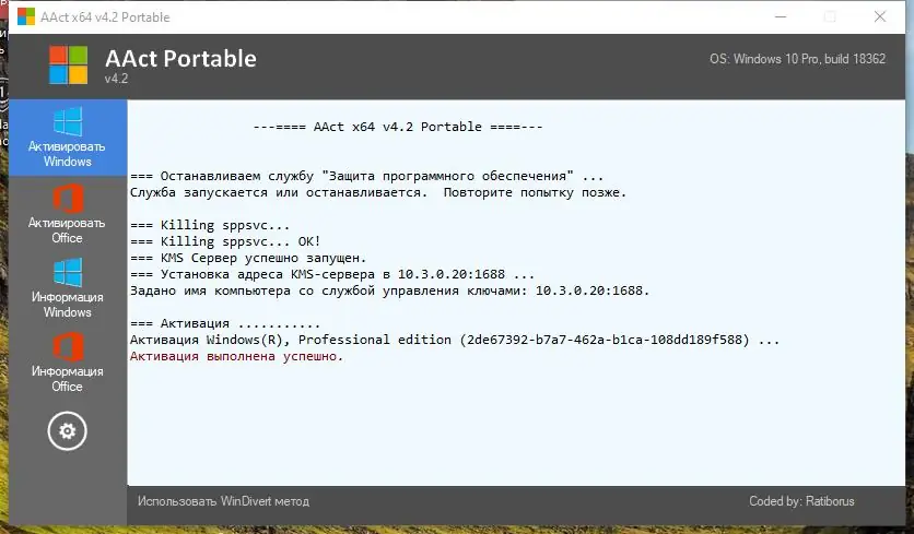 Программа AAct представляет собой KMS-активатор, предназначенный для активации операционных систем Windows VL редакций: Vista, 7, 8, 8.1, 10, 11, а также серверных версий: Server 2008, 2008 R2, 2012, 2012 R2. Поддерживается активация Office 2010, 2013, 2016 и даже Office 2010 VL на Windows XP. Разработана с применением оригинальных технологий и реализует уникальный подход к конструированию программных средств активации. Программа не требует предварительной установки .NET Framework, что делает её более удобной и быстрой в использовании.