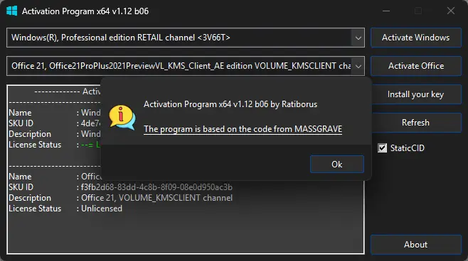 Activation Program — это уникальный инструмент, предназначенный для off-line «активации» лицензионных продуктов Microsoft, включая лицензии ESU/OCUR на Windows 7. Программа позволяет изменять запись о активации внутри «Надежного Хранилища» Windows, не требуя подключения к интернету. Обратите внимание, что она НЕ активирует Office 2010-2019 на Windows 7. Использованный код разрабатывался группой MASSGRAVE «TSforge (c) MASSGRAVE 2025».