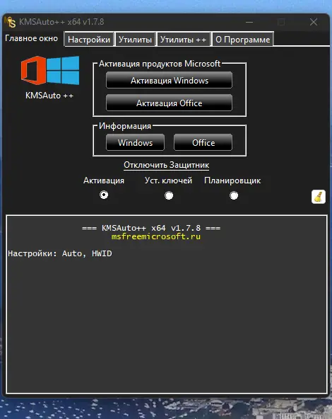 KMSAuto++ — это мощный KMS-активатор для операционных систем Windows VL редакций, а также для офисных продуктов Office 2010, 2013, 2016 и 2019. Одновременно с активацией системы и офисных приложений, программа включает в себя дополнительные утилиты и установщик Office, предоставляя решение «всё в одном». Отличается простотой использования и отсутствием навязчивой визуальной составляющей, что делает её популярным инструментом среди пользователей, предпочитающих минимализм и эффективность.