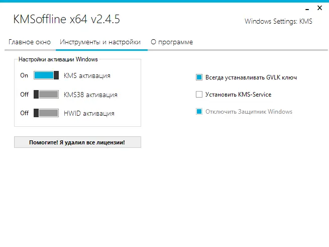 - Активация Windows и Office с помощью встроенного KMS-Service или удаленного сервера